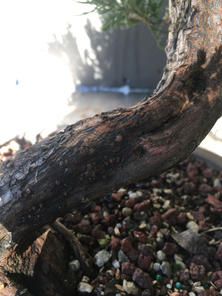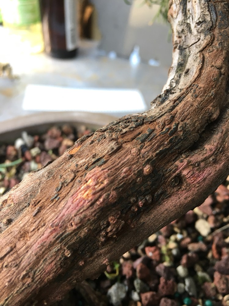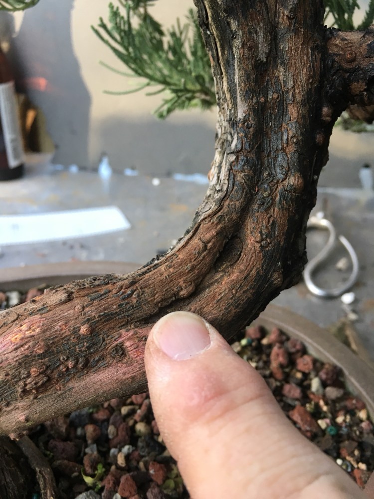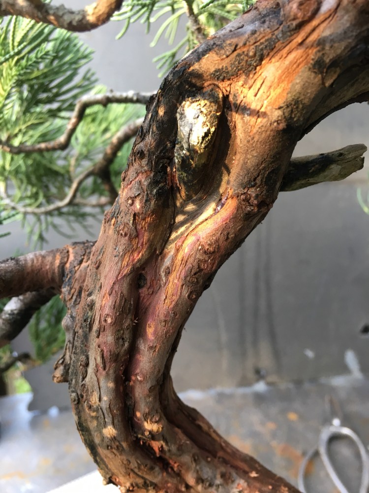 The stronger the sap line, naturally, the stronger the tree. By removing the top layer of bark, the juniper will replace it by growing more. The more bark growth, the more prominent the sap lines become. Kathrin has been taking care of this juniper very well.