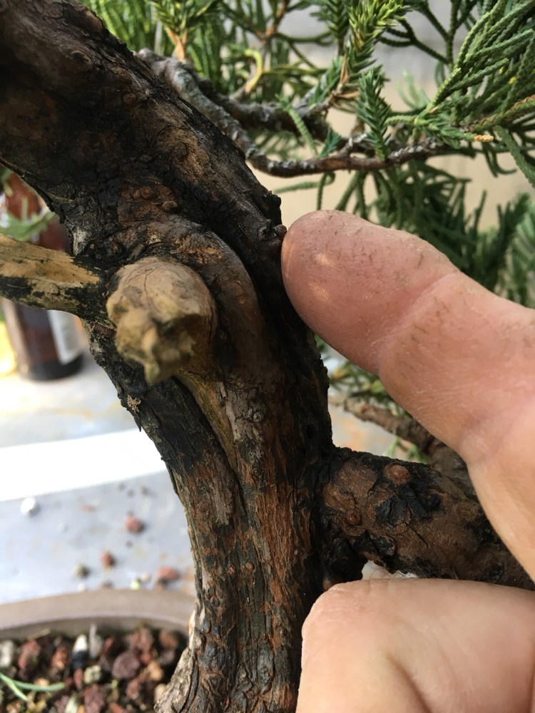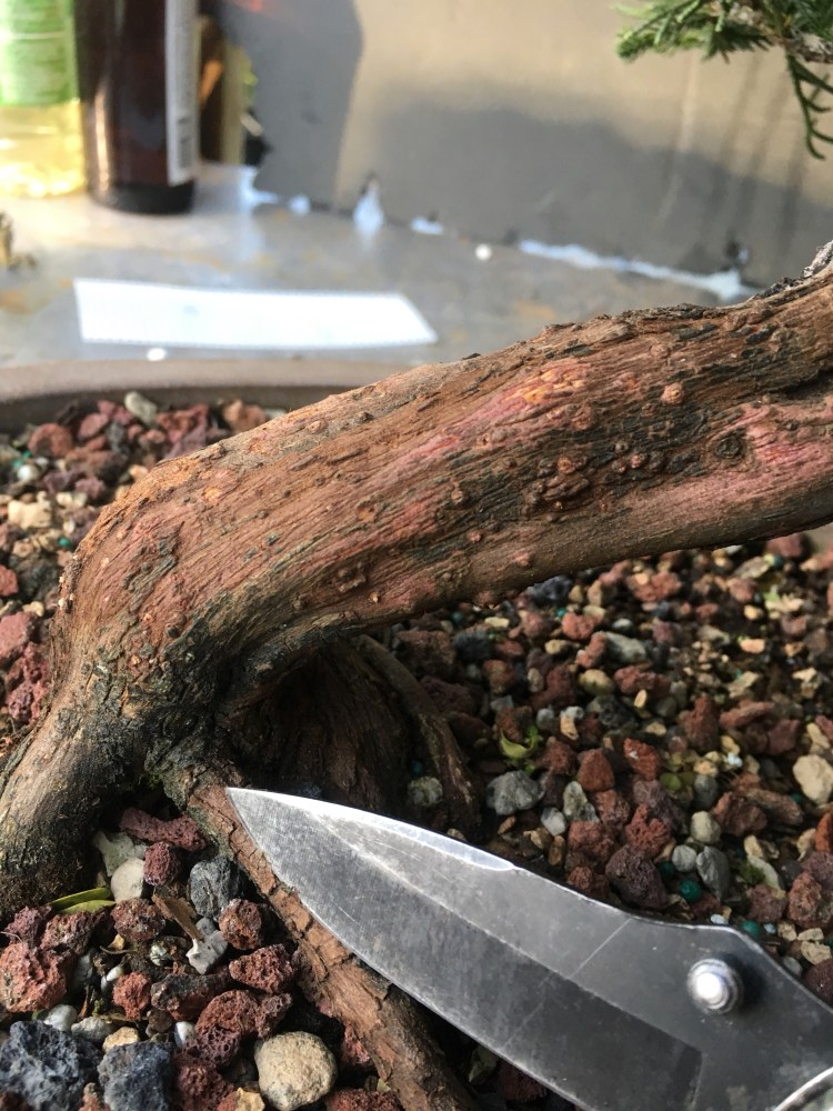 Above, you can see the root at the end of the sap line. On most junipers, you can trace the sap line from the root to the foliage. This makes them predictable when pruning; often, if you kill a branch on top, it kills the sap line to the root. I say often, the younger the tree the less often this happens. A good example is below.