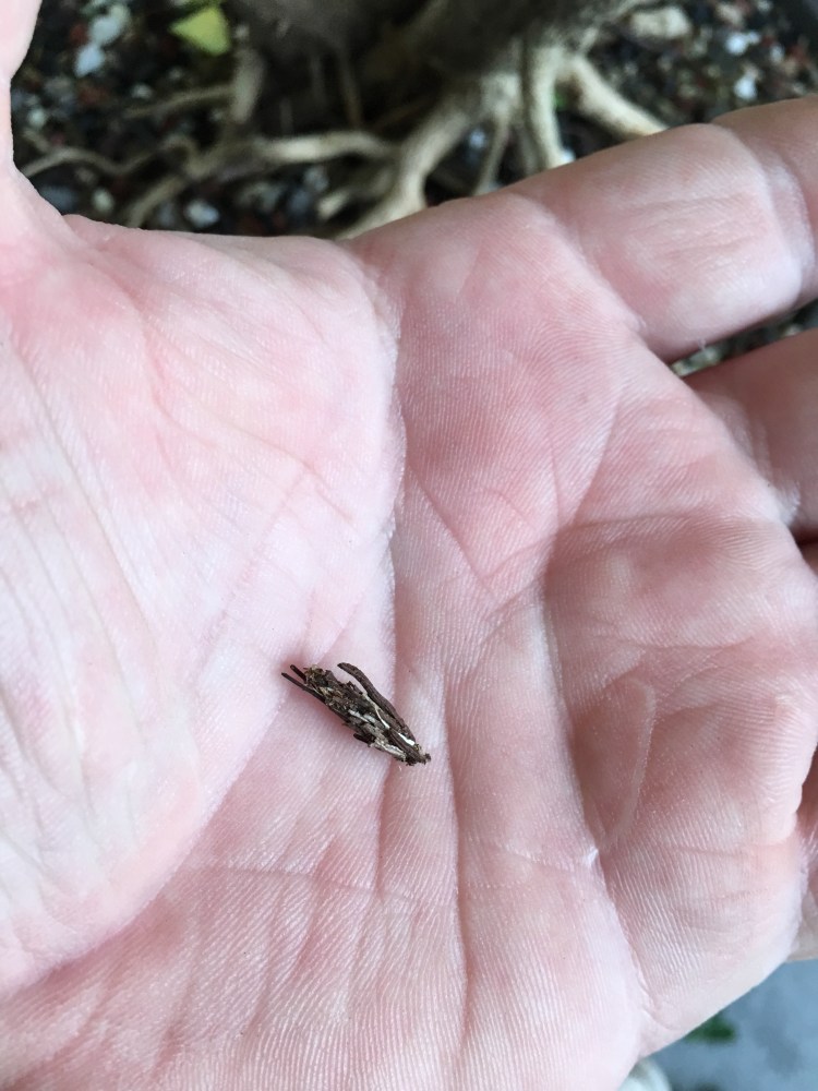 One advantage of getting up and personal defoliating a tree is you get to see flaws, or problems, and, importantly, harmful bugs. Here’s a bug that seems to be everywhere this year. A bag worm.