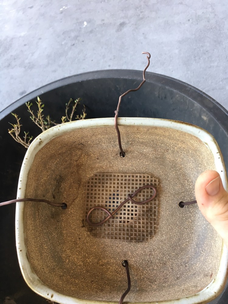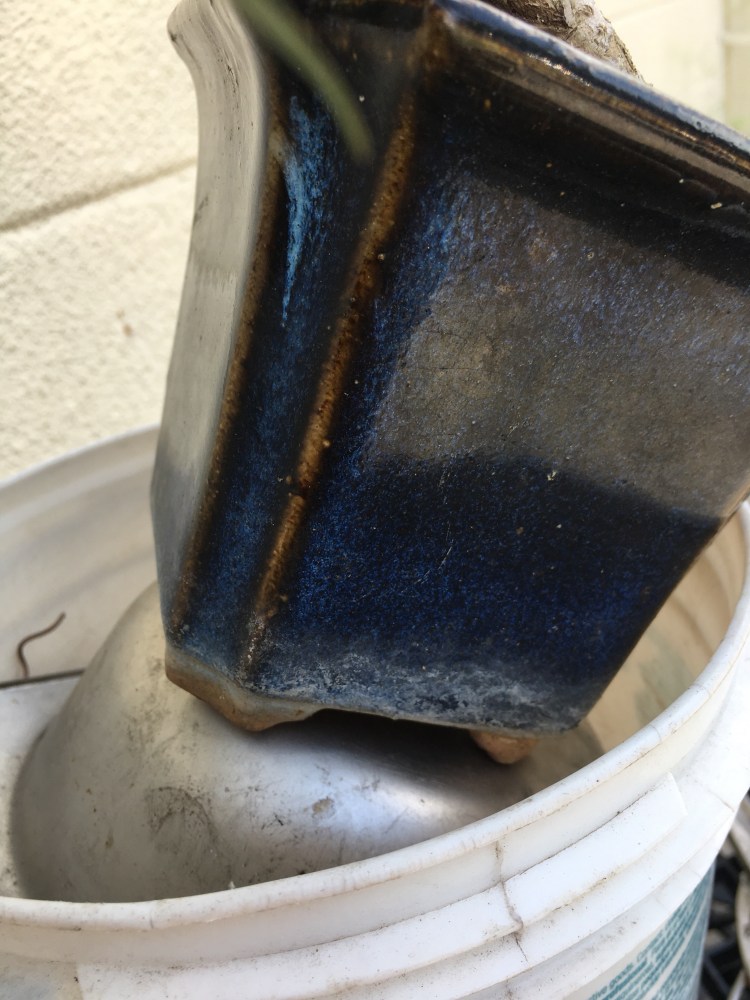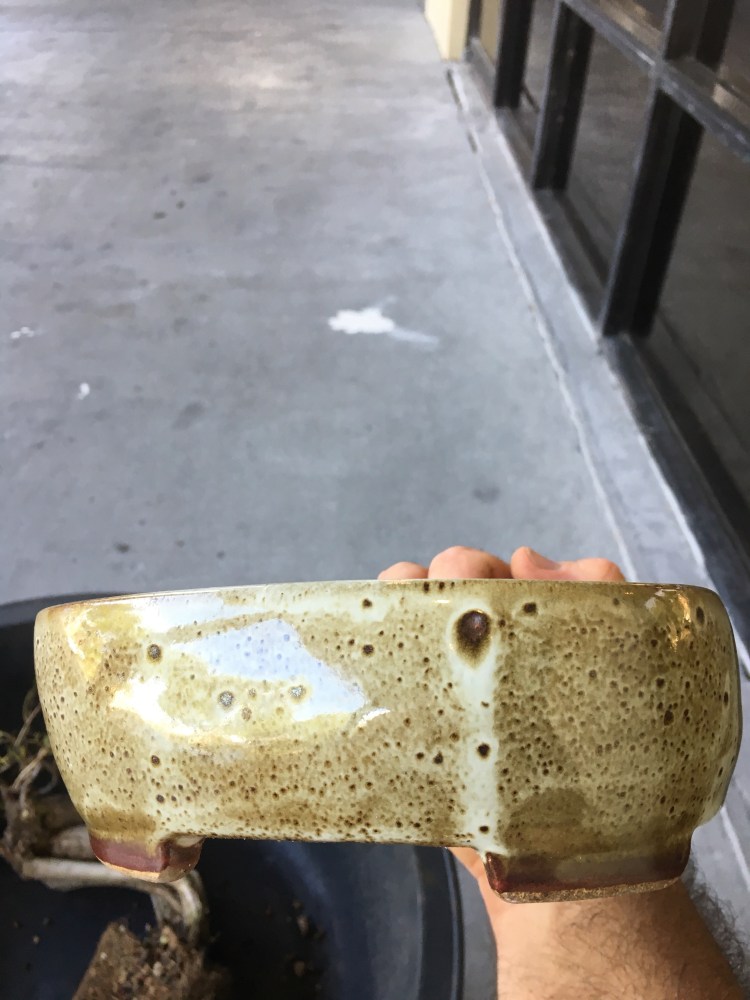 Here’s the new pot. I’m not sure of the maker but I believe it’s a full time potter who just made a bonsai pot.