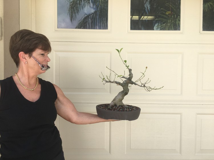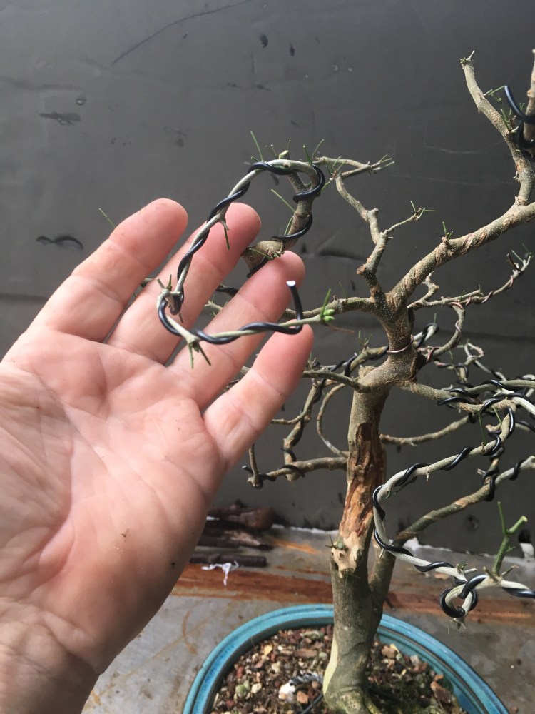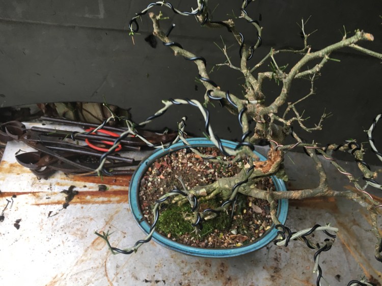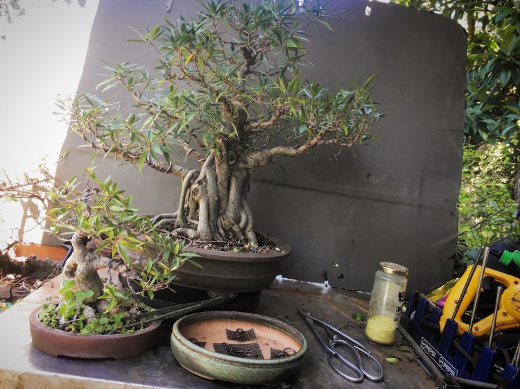 And that is her ficus microcarpa she started from a cutting. She is deep in process of slowly building the structure, growing out the trunk, with wired movement, then the branches. Growing them, wiring, then cutting back. That’s the point she is at now. The next step in the process is the thickening of the secondary branches.