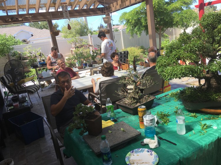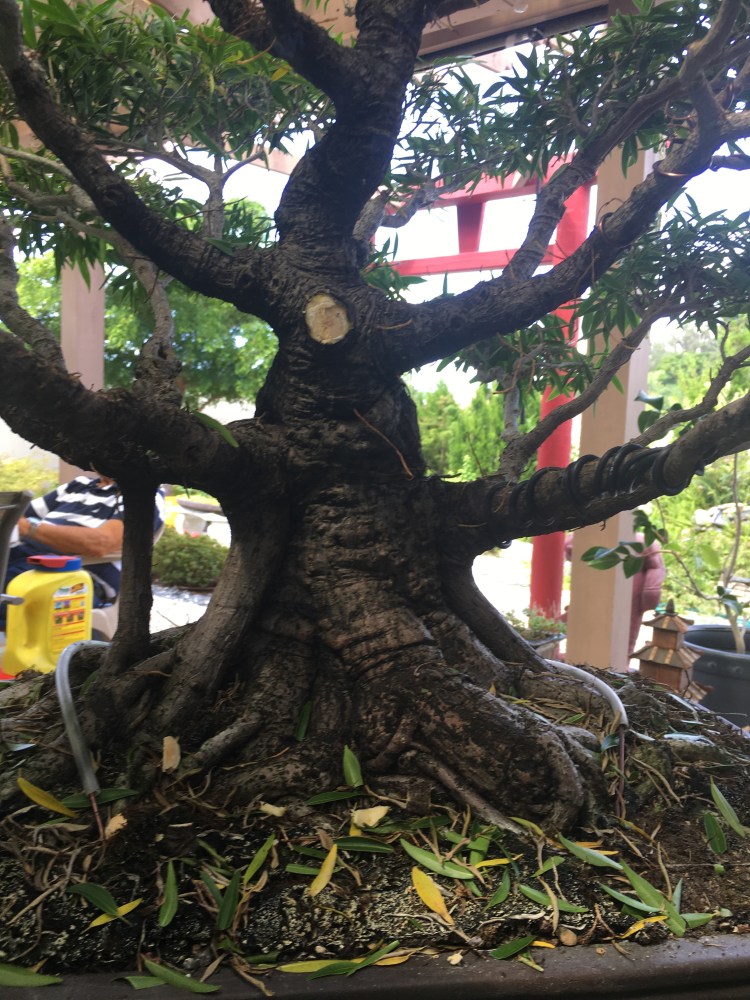 He let it grow, chopped it, wired it, let it grow. But he followed the process (there is a blog post I wrote about it a few years ago when I was boarding the tree for a few months while he was moving and setting up His new house). Now it’s a show stopper. But it’s still developing…..notice we took off a front branch to open up that amazing trunk line. It has near perfect taper and subtle movement. This is, in my opinion, one of the best banyan style willow leaf ficus in the state.