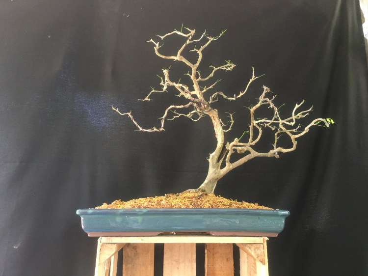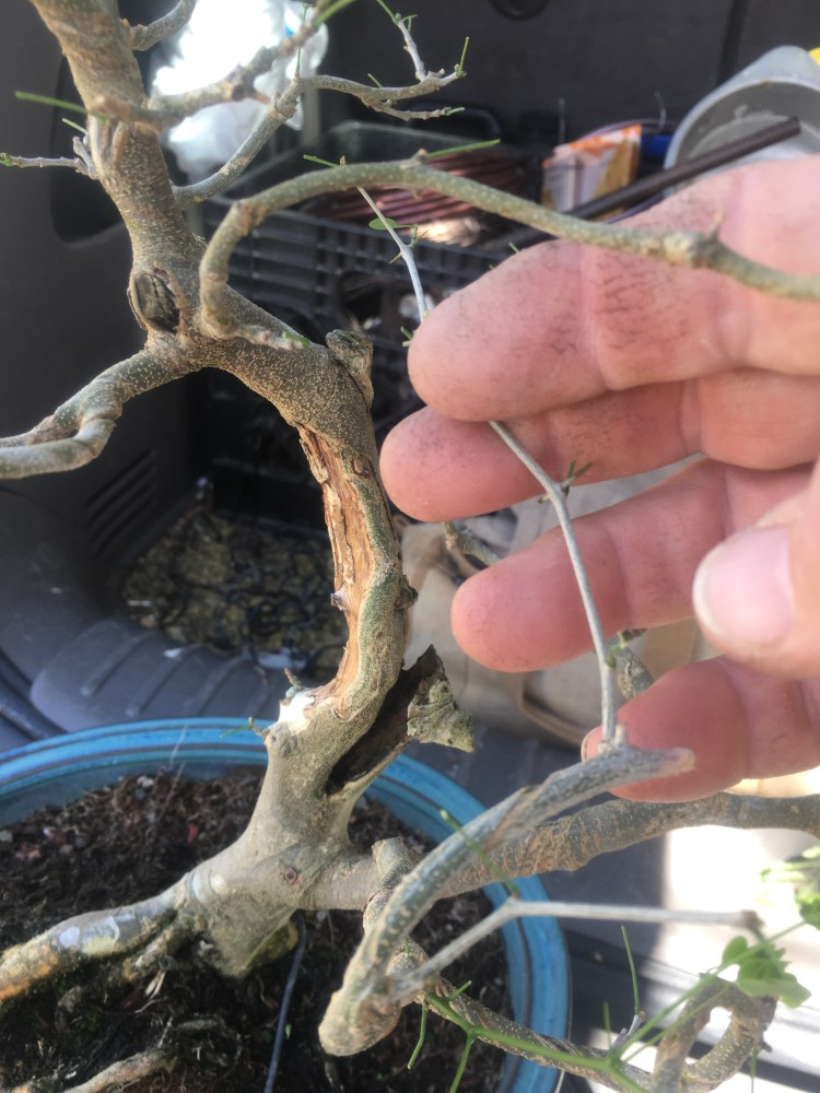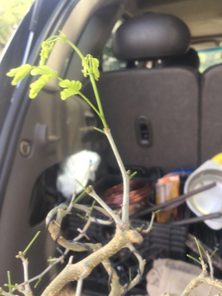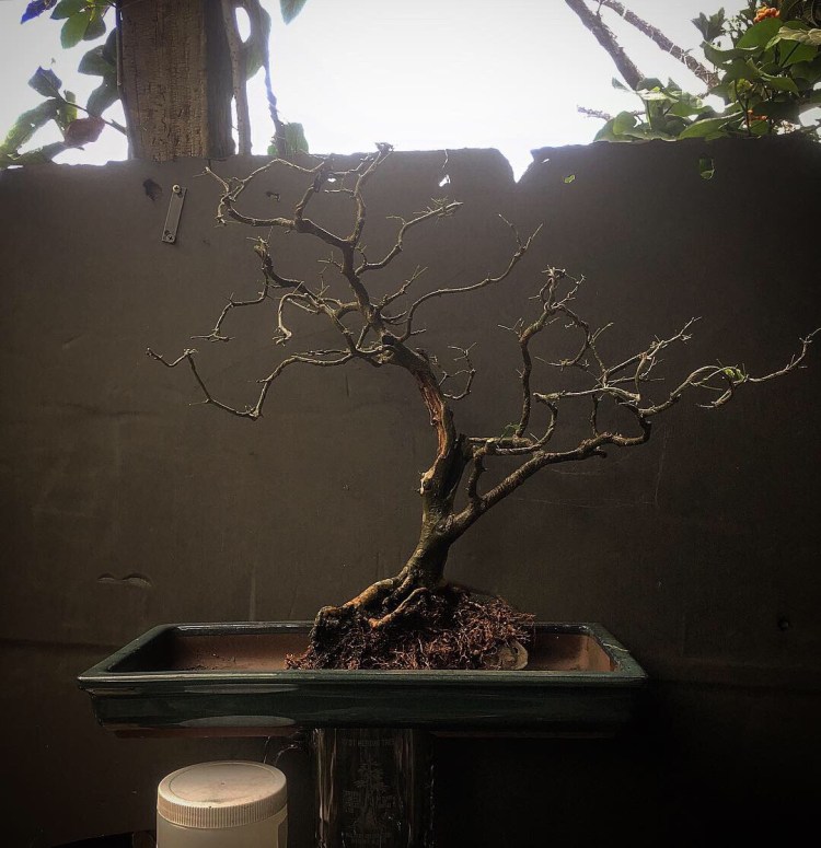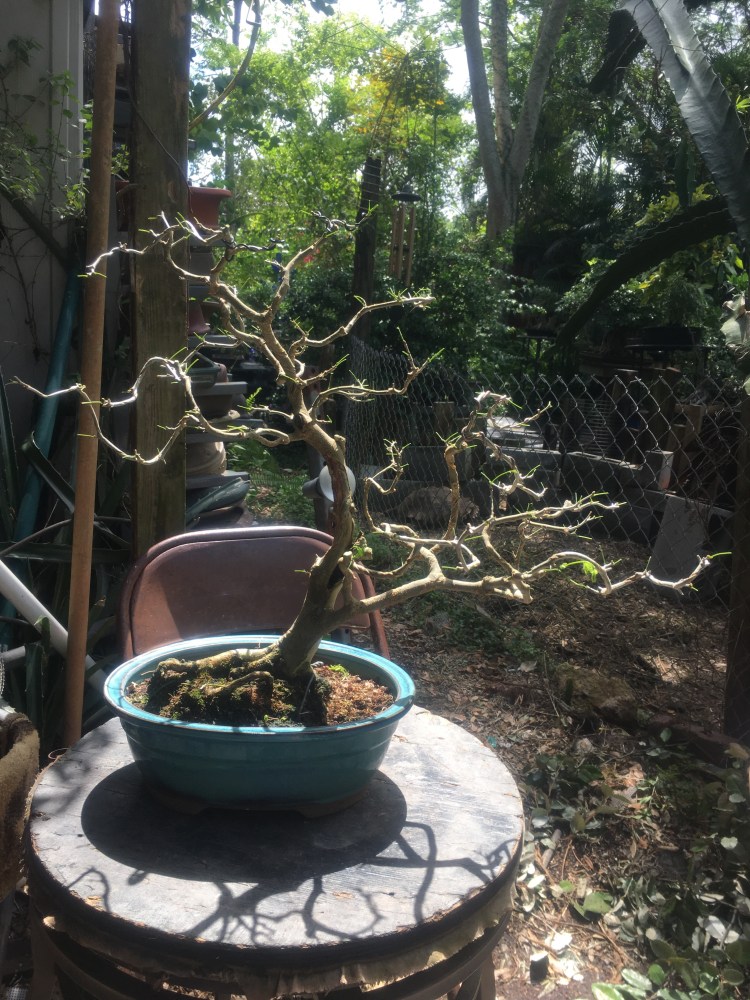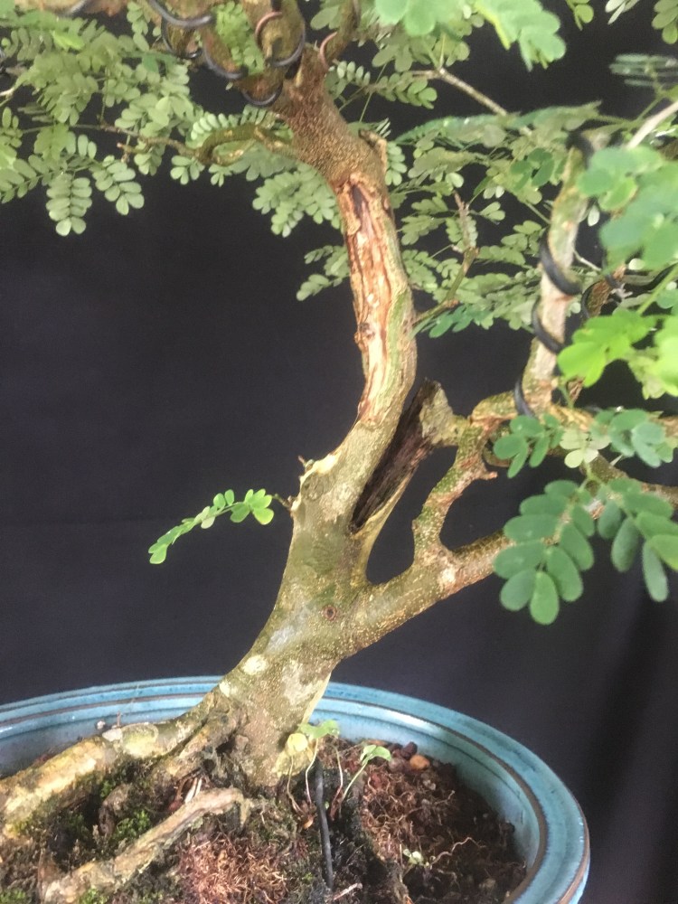 But this Raintree, which I styled to look like a natural tree growing in a pasture where cows can take shade from the Brazilian summer sun should be viewed from afar (kind of like my singing is best heard….from afar), almost the same way we look at tall Japanese maples in wide, shallow pots. The natural habit of a Chloroleucon tortum is to be twisted and contorted, hence the “tortum” part.