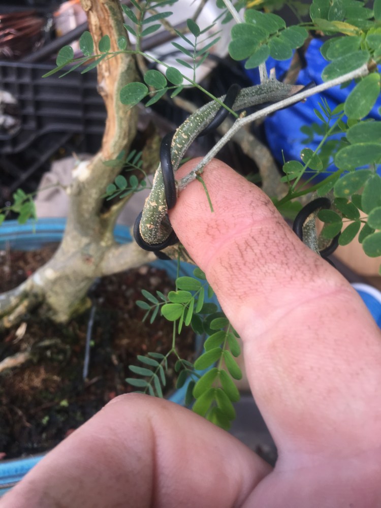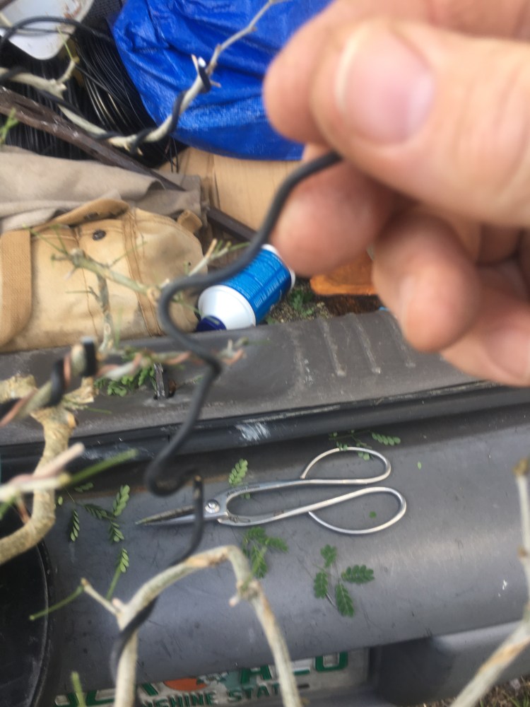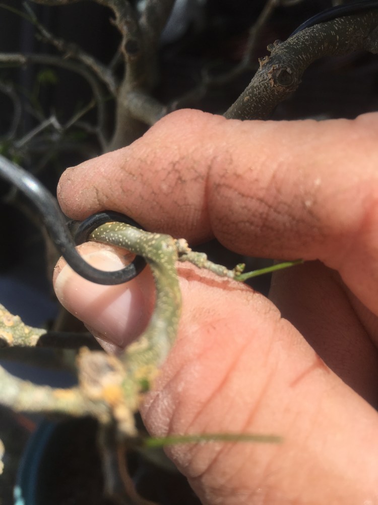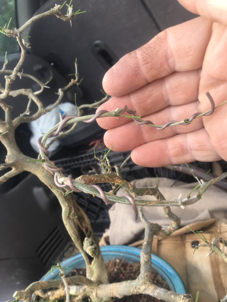 I know I’m hurrying but I should make note, I teach unwinding with my students as well. Not only do you get to reuse the old wire (reduce/re-use/recycle) but, more importantly, it trains the hand how the wire and the branch respond when you move the wire around.