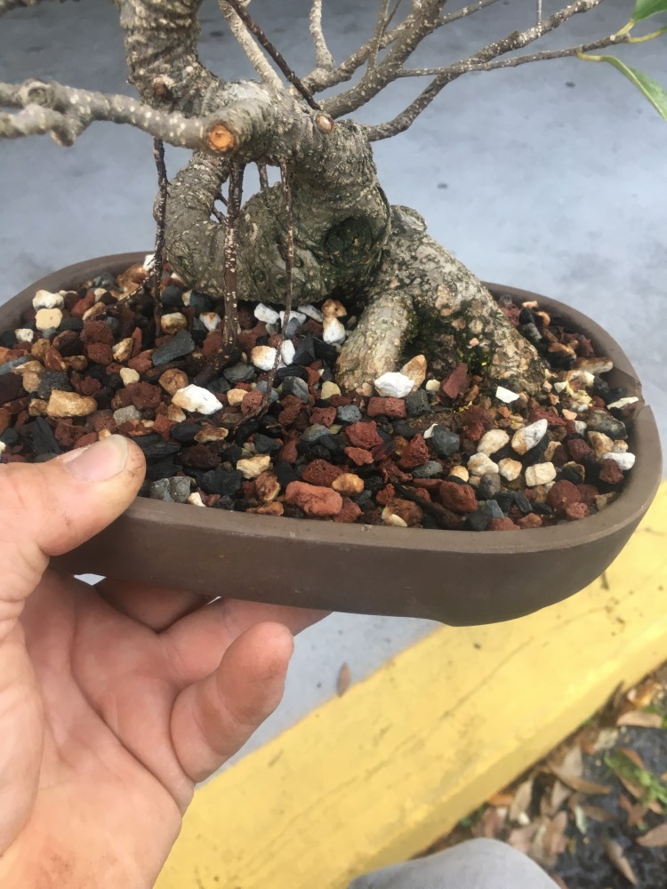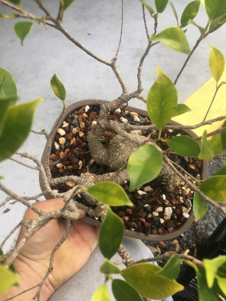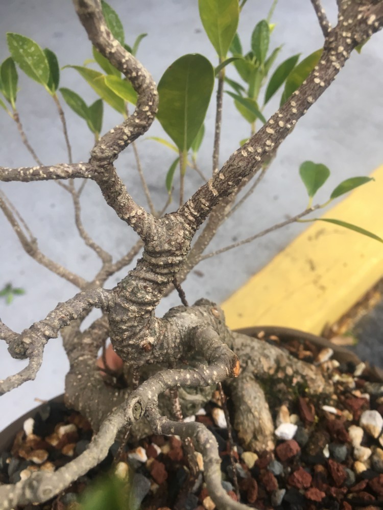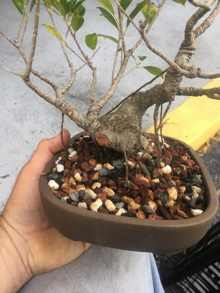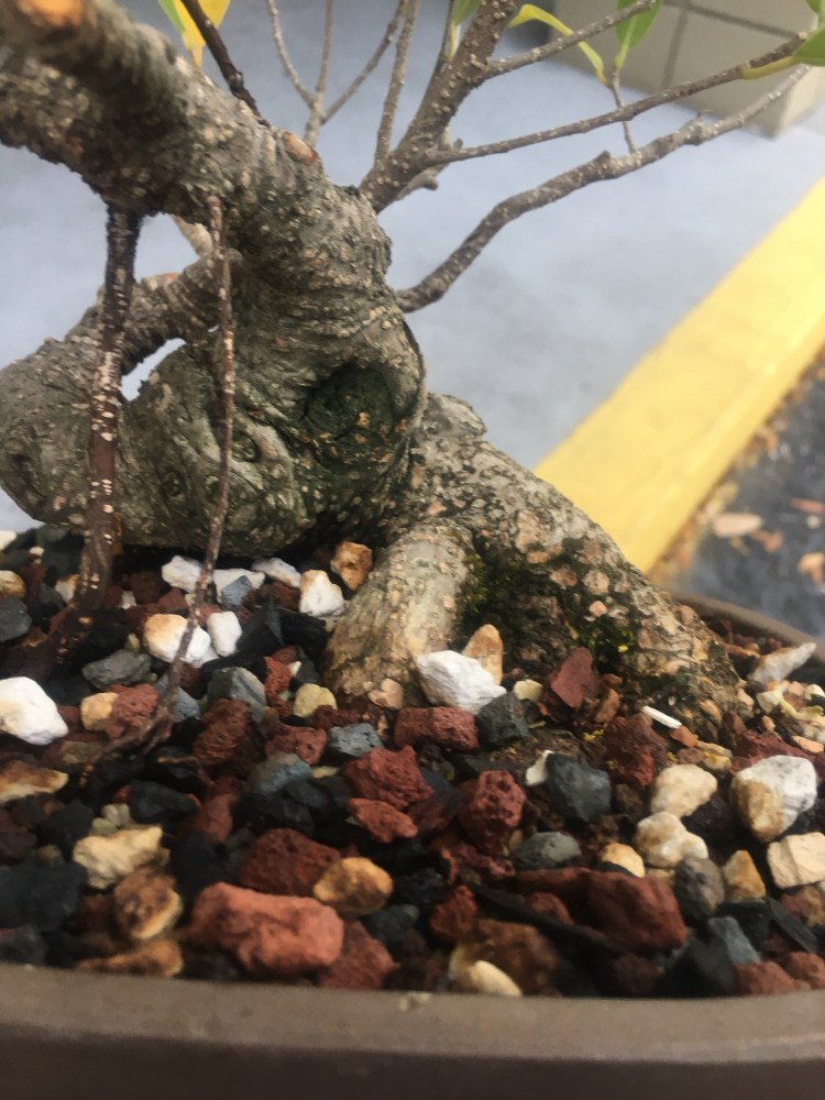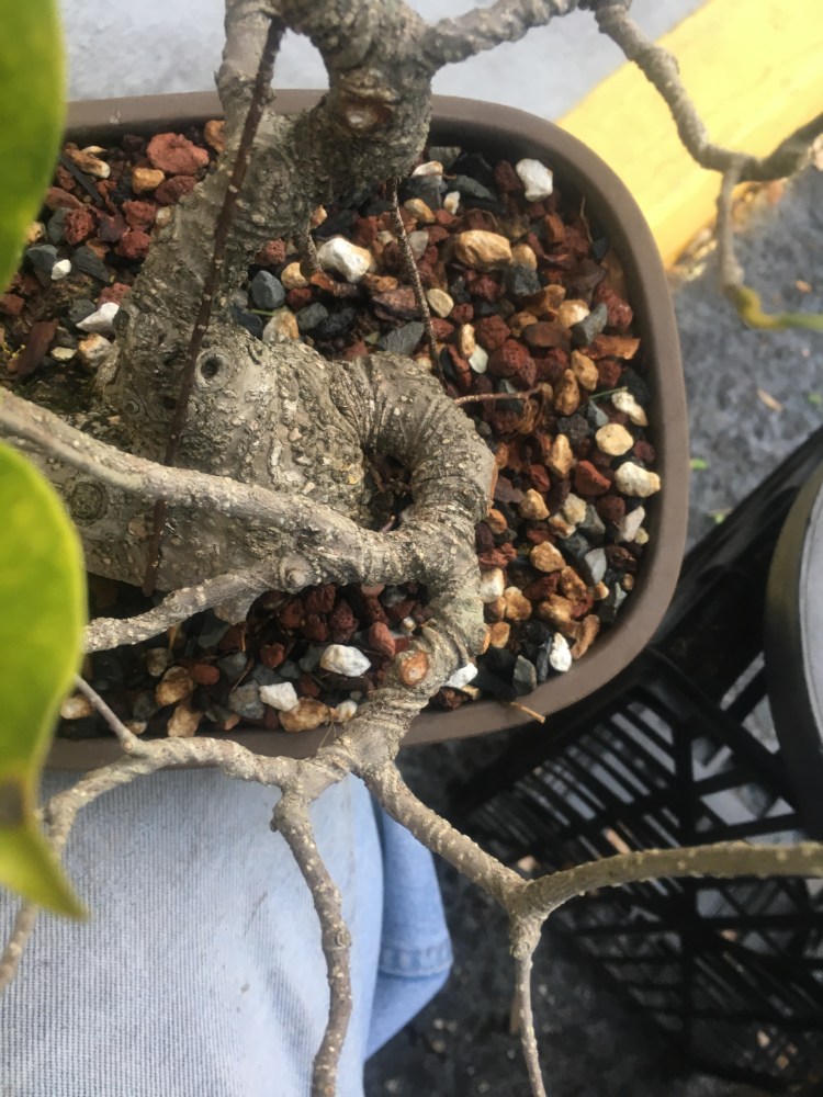 I just repotted this tiger bark ficus into a wider pot. Zooming in close, on the left side, you see…..a hole?