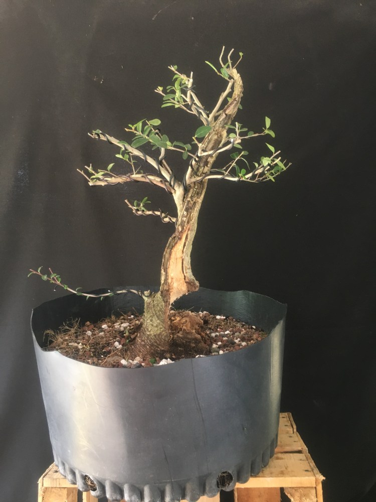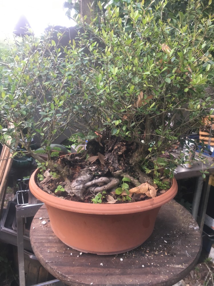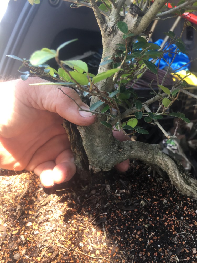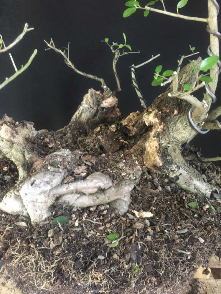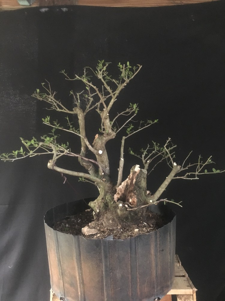 Which means that the roots as they enter the soil (nebari) are strong and radial, there’s a hole in the trunk (uro) , and it resembles a Japanese apricot in its growth habit (ume, which tends to have angular movements and lots of rotting wood).