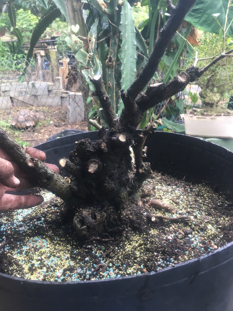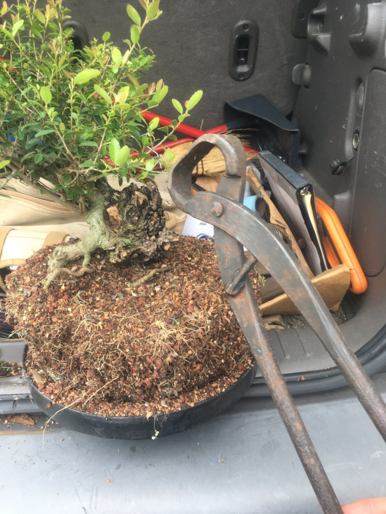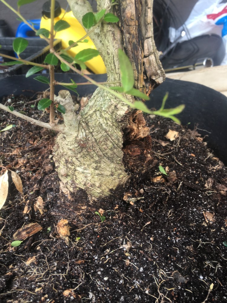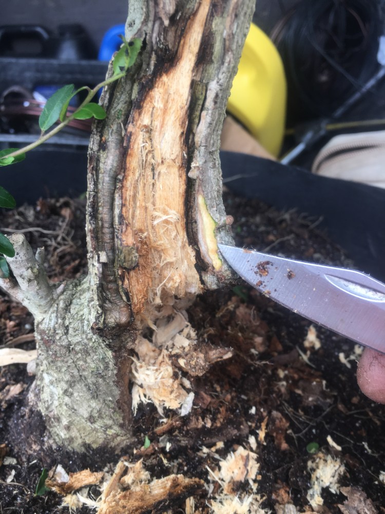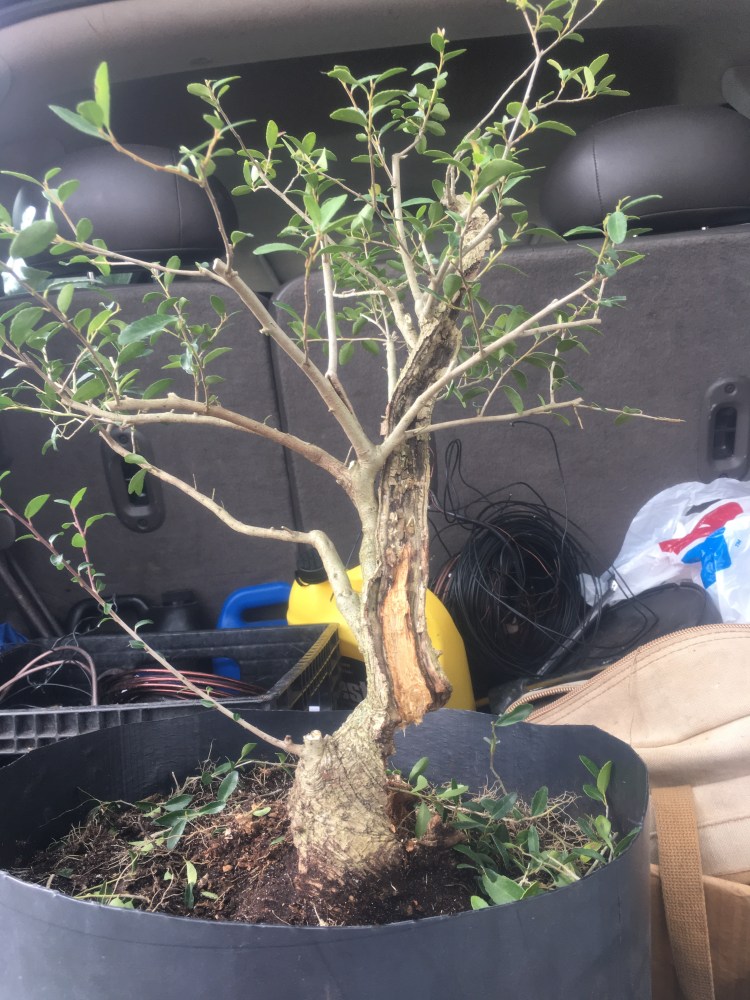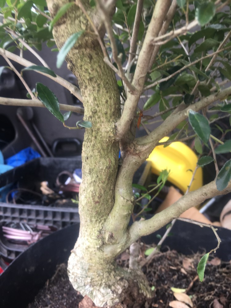 Which means that the roots as they enter the soil (nebari) are strong and radial, there’s a hole in the trunk (uro) , and it resembles a Japanese apricot in its growth habit (ume, which tends to have angular movements and lots of rotting wood).