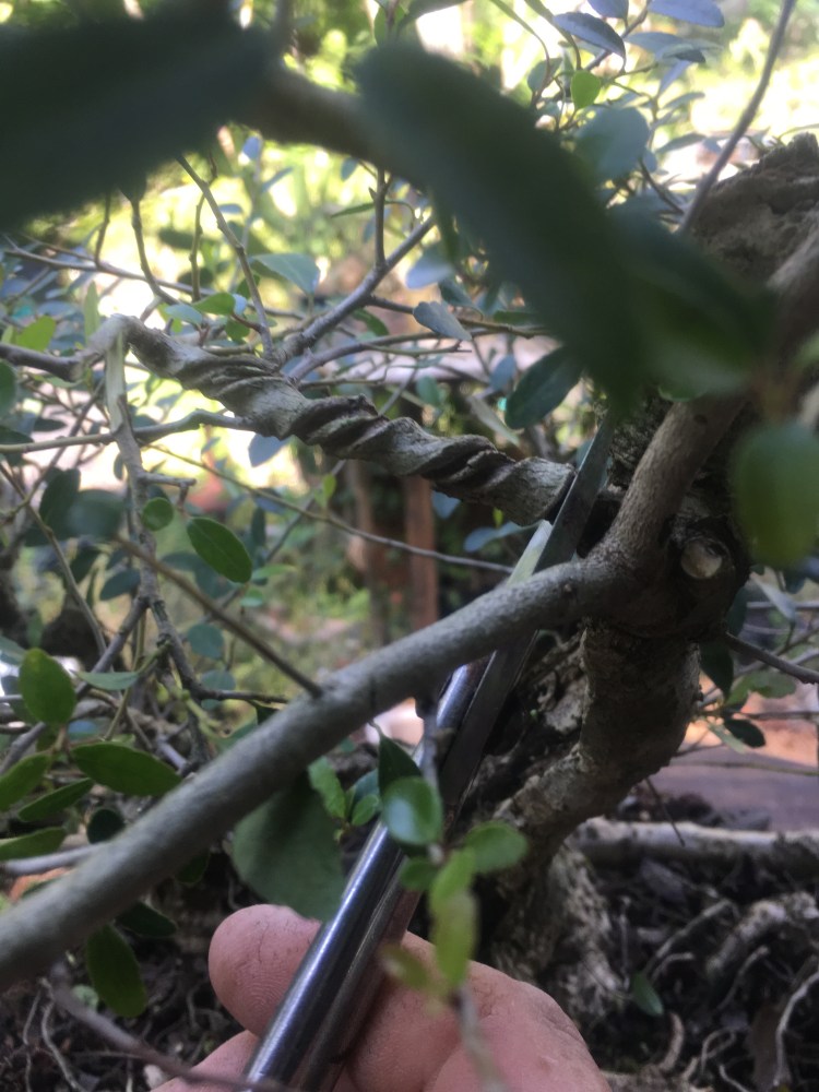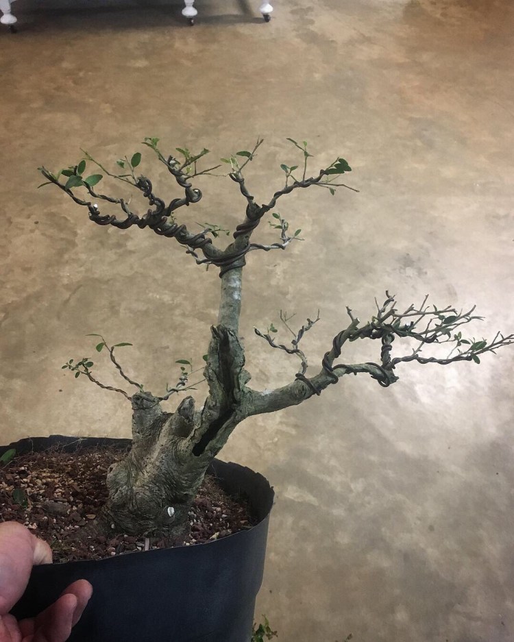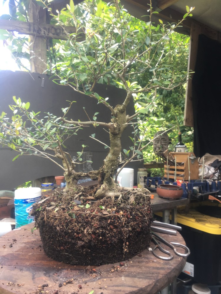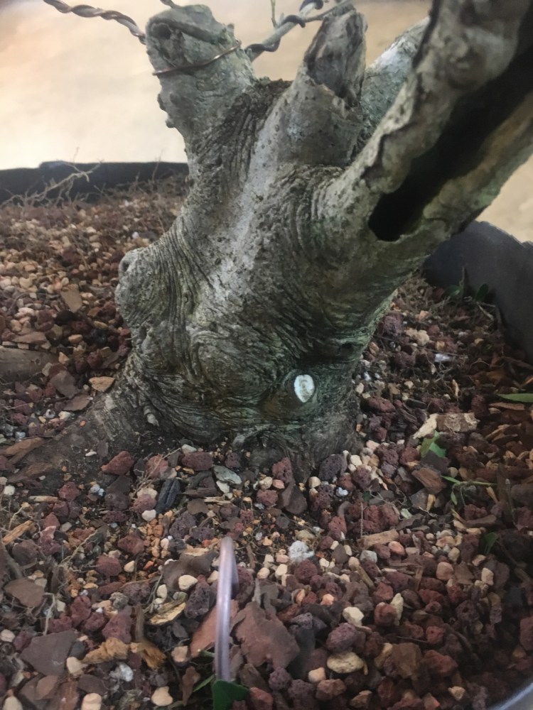 Which means that the roots as they enter the soil (nebari) are strong and radial, there’s a hole in the trunk (uro) , and it resembles a Japanese apricot in its growth habit (ume, which tends to have angular movements and lots of rotting wood).