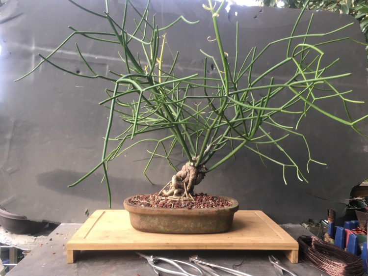 It’s a euphorbia tirucalli, a milkbush or, more commonly, a pencil cactus. I’m not pretending it’s a bonsai, at least not yet, but look at the trunk?!