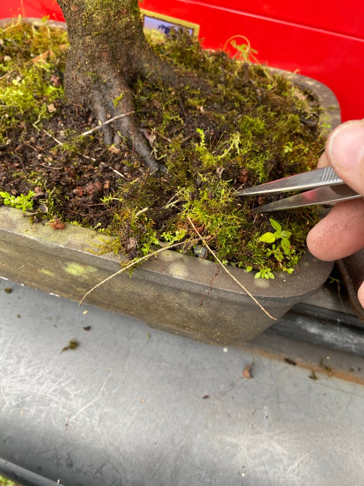 Cleaning off the weeds and moss, we can begin to see the root spread.