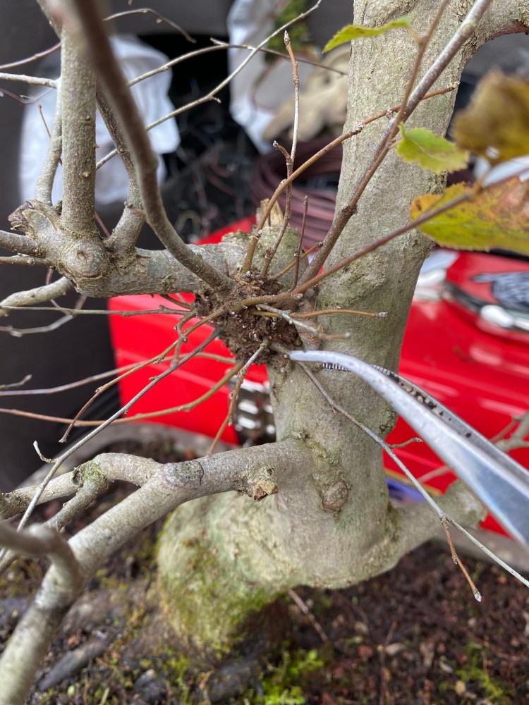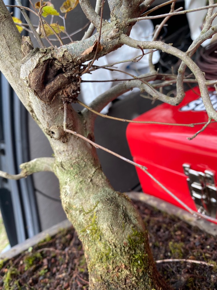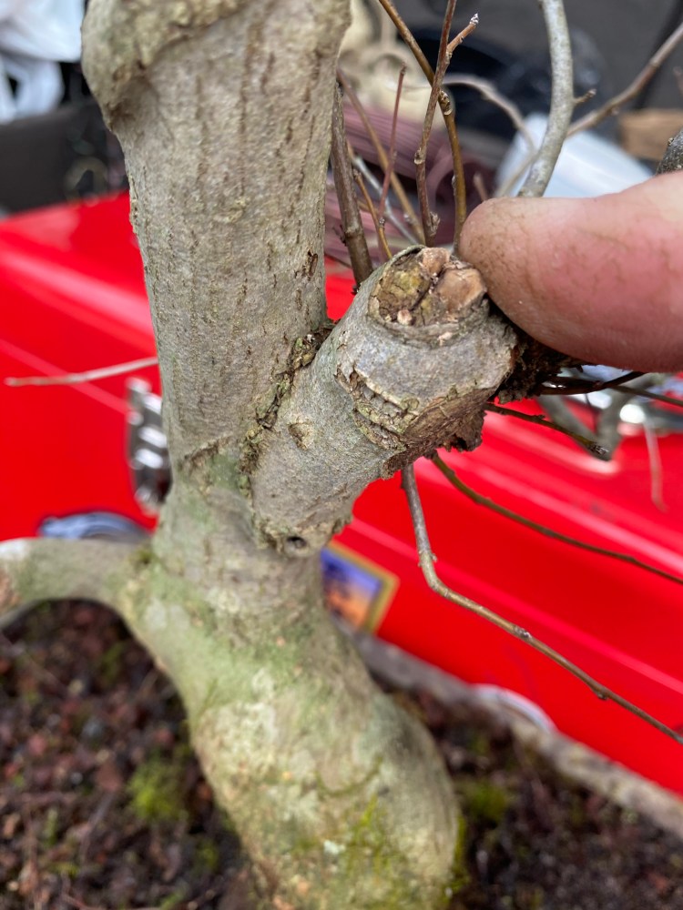 An American hornbeam doesn’t heal well, so I tend to incorporate the pruning scars. Here’s where I chopped it last time I worked it.