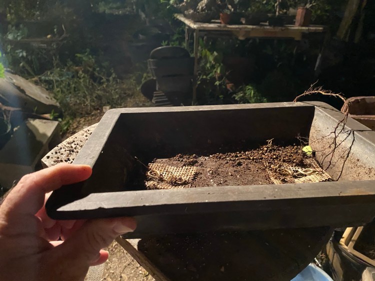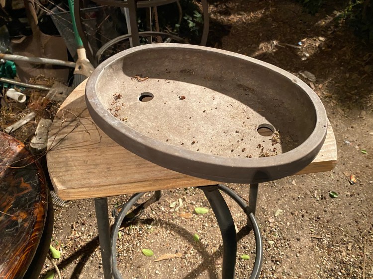 I was thinking to use this pot. It’s not a bad shape. I think it’ll fit. I’ve trained many a tree in it too. It has a presence in The Nook. I think I’ve had it prit near 15 years. Very serviceable.