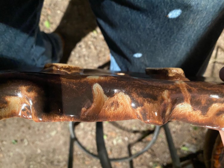 Doug is learning about all types of glazes and shapes. He had to in this case, he made this shape because he accidentally broke a similar style container of mine, and felt bad about it.