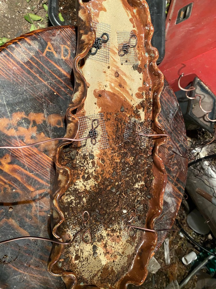 Drain hole screens, tie down wires, and, since we saw some significant mycorrhizae , I threw a handful of old soil on the bottom.