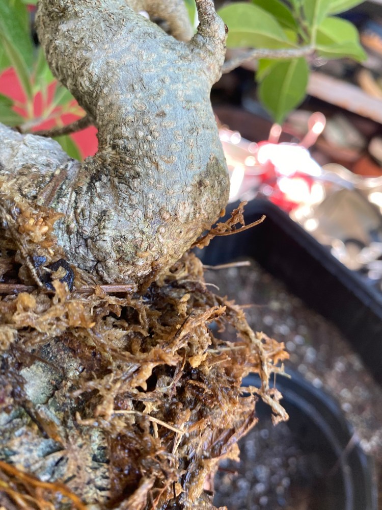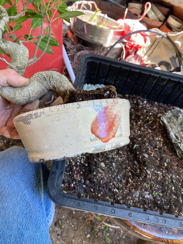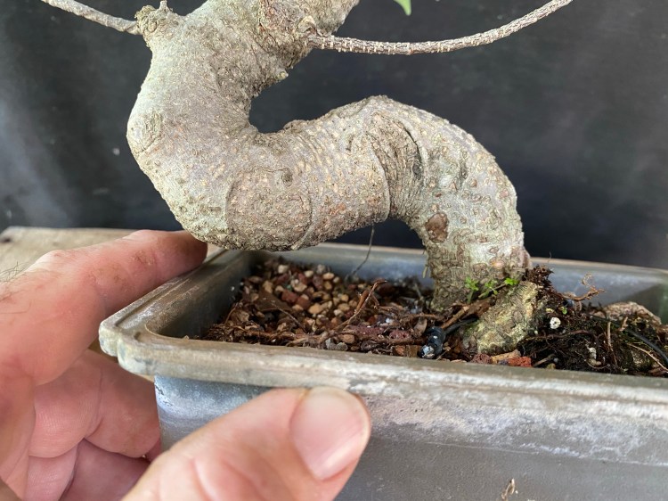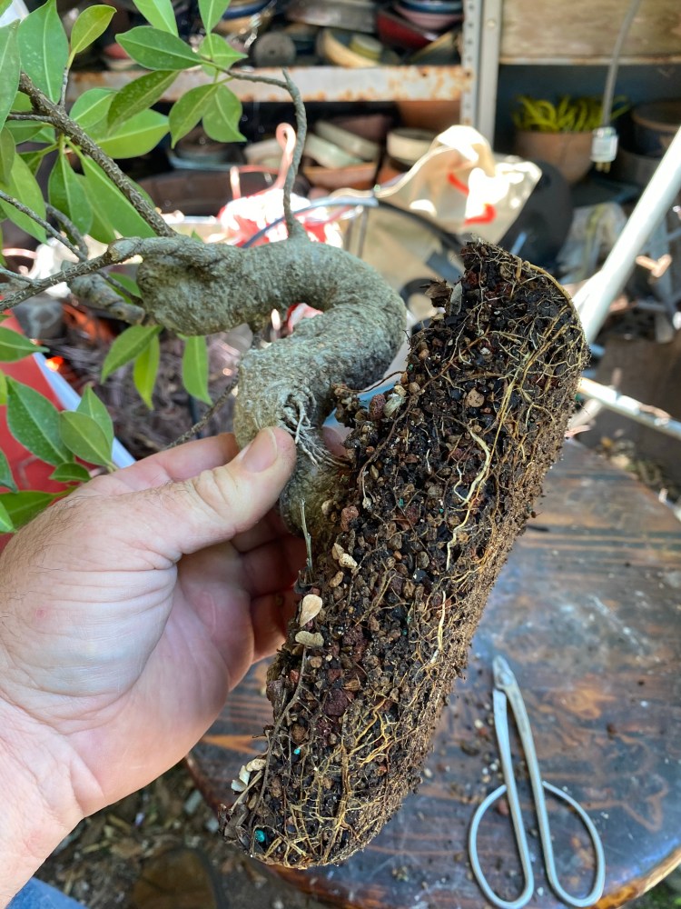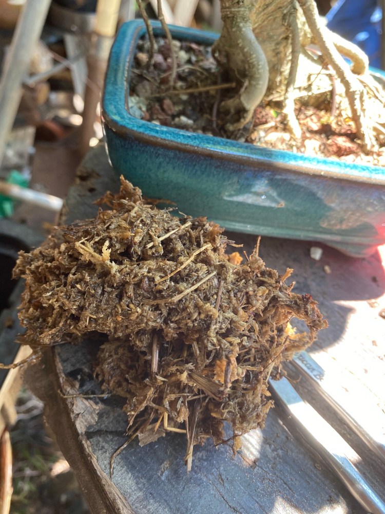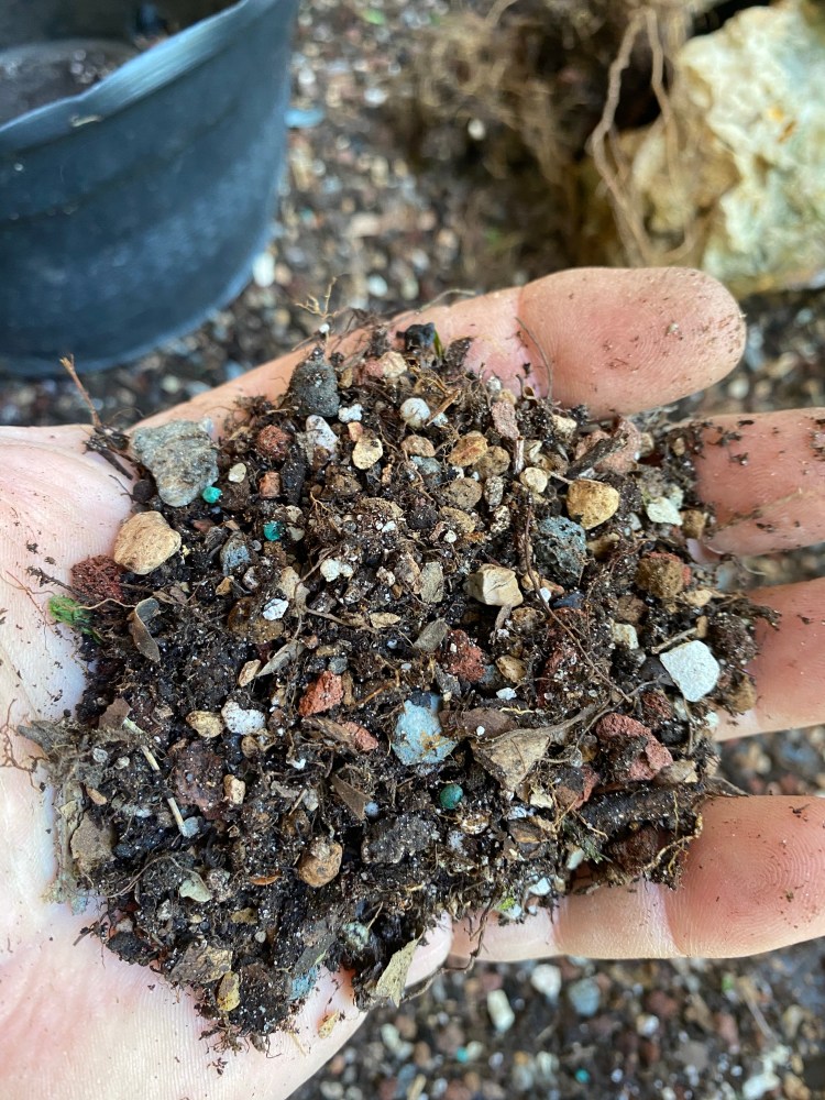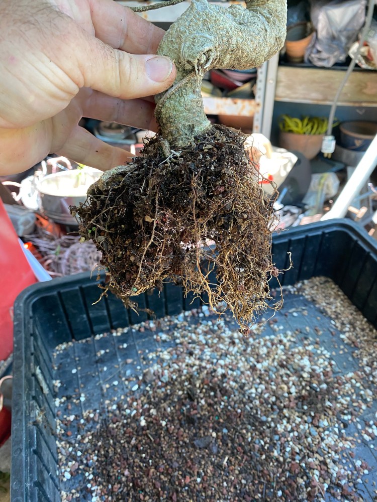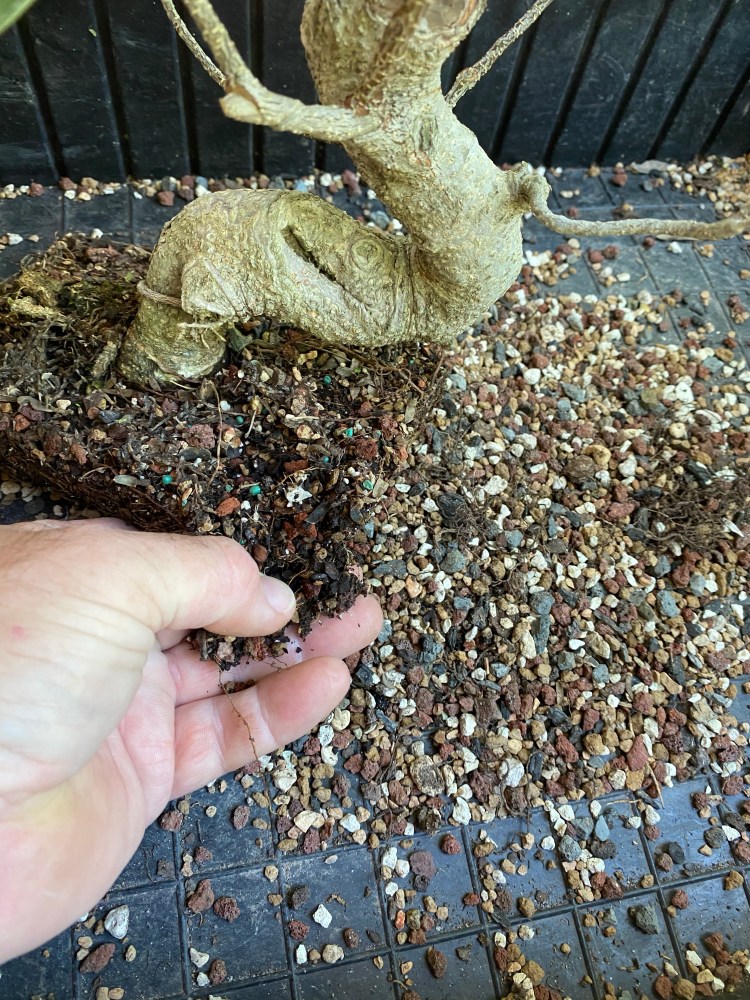 No special (insert famous bonsai professional’s name here) soil mix. Sorry, substrate. just a regular soilless potting mix, and I added in the stuff I raked off the roots about 25 pics ago,…