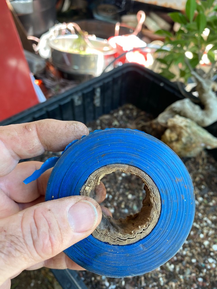 I don’t have any grafting tape (or a ring) but this marking tape will work just as well. You can use anything to bind it really, but the blue shows up well on camera. You’ll see what I mean lower on the page.