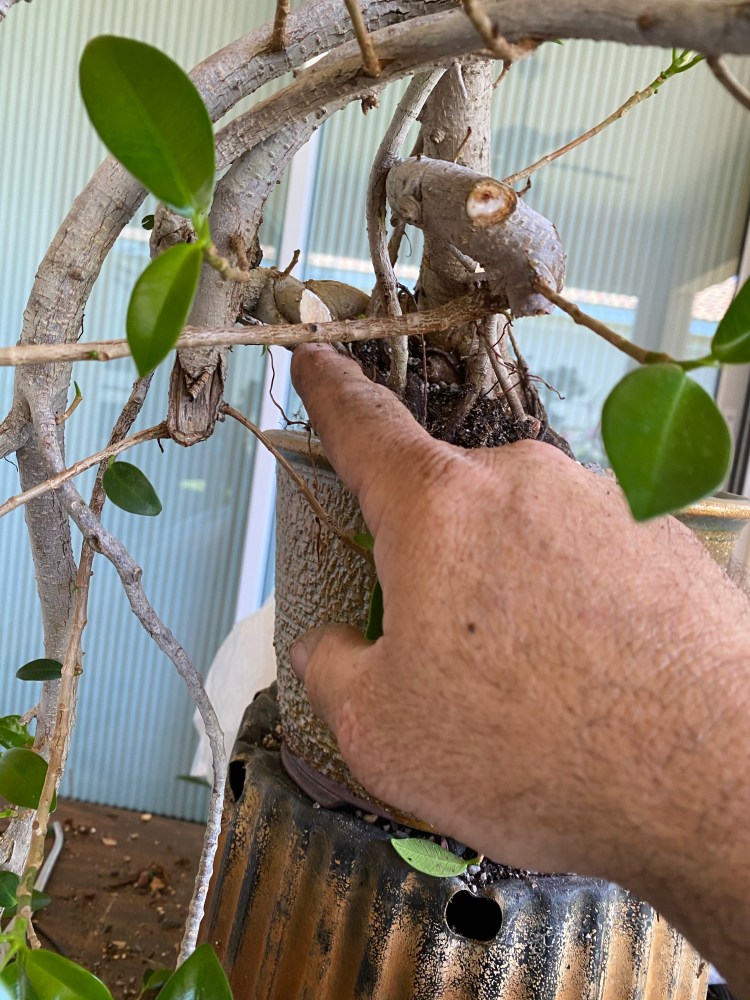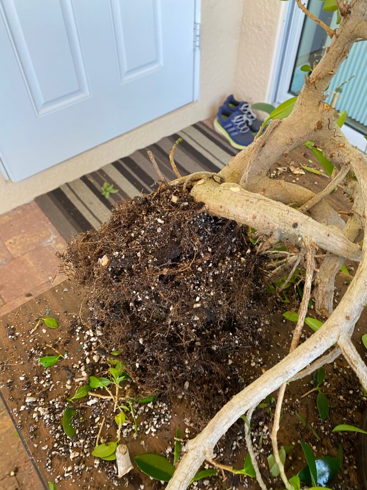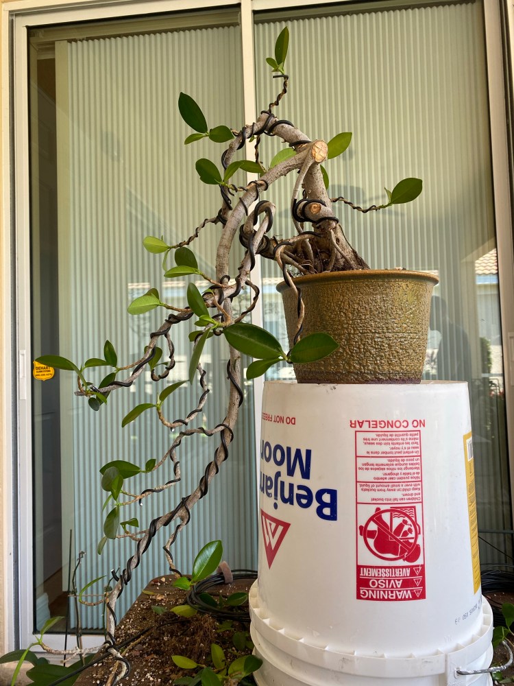 The tree belongs to Steve-o, from one of the Sarasota studygroups. We had yanked it off a much larger ficus he found at a plant rental company (if I remember that correctly. And yes, there are companies where you can rent plants, yearly, monthly or just for an event).