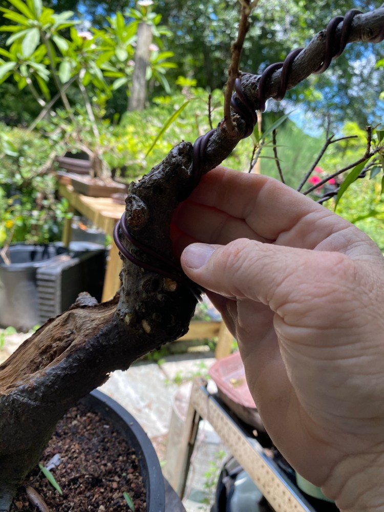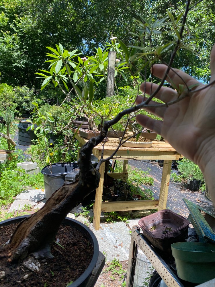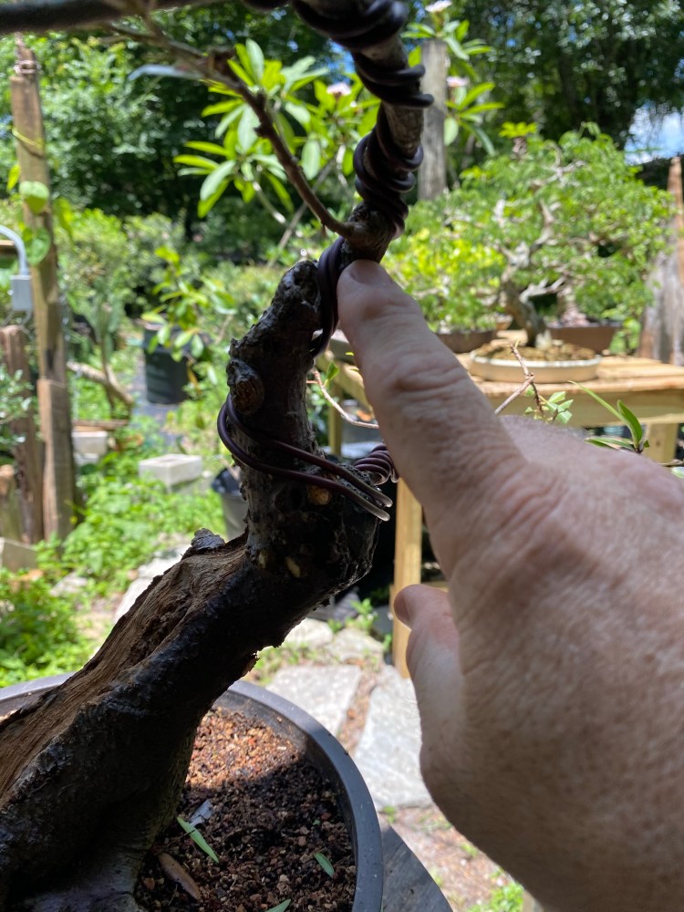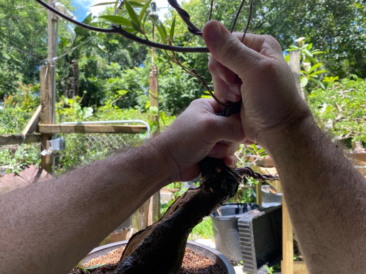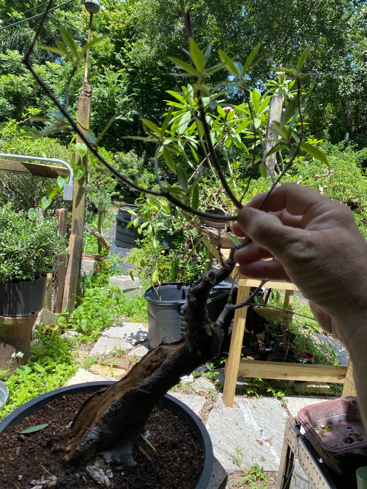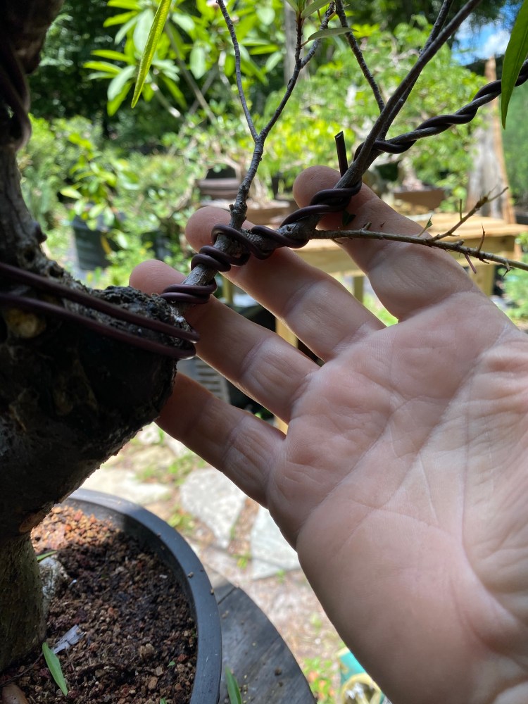 After some pruning, whittling down, of branches, I don’t think I need (the only bottom branch I’m keeping is the back branch I was fondling two pics up), now we are ready for wire and shaping.