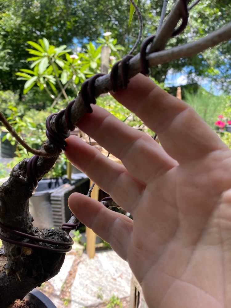 This is an initial styling, so the wire is spaced out (not perfectly next to each other) which will help you keep the branch from snapping when you do the bend. It’s also loose. I need to keep it on for a long time, so the looser (as long as I have good support still) the better. Less wire marks.