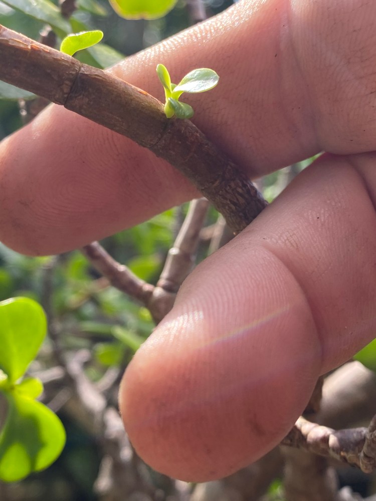 Here’s a teaching moment: this brand new bud illustrates the concept of what a node is and how a Portulacaria only shoots new growth at a node. The segment where the shoot is emerging from is the node, and the internode is the space between (hence the prefix “inter”, meaning “between” )