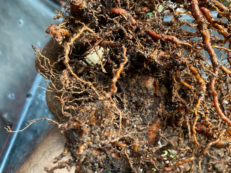 There we go, that should work. I don’t usually remove so much soil and “bare-root”. But I need some better drainage.