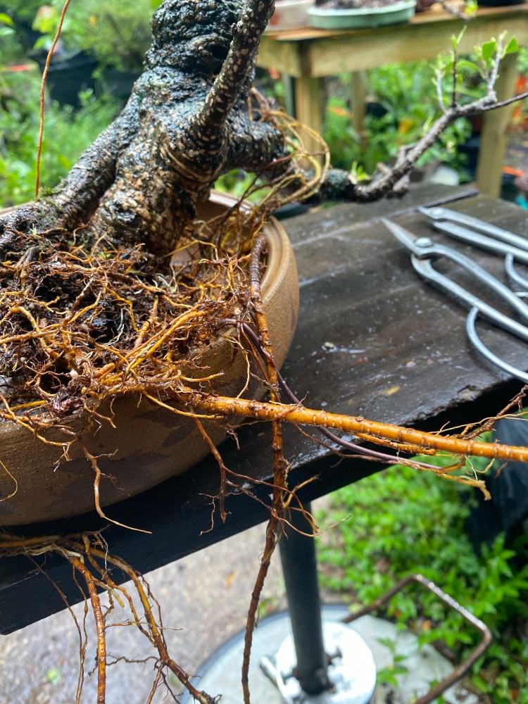 Weeded, bareroot, it’s clear we need more nebari. It’s an interesting tree but the root spread needs some definition.