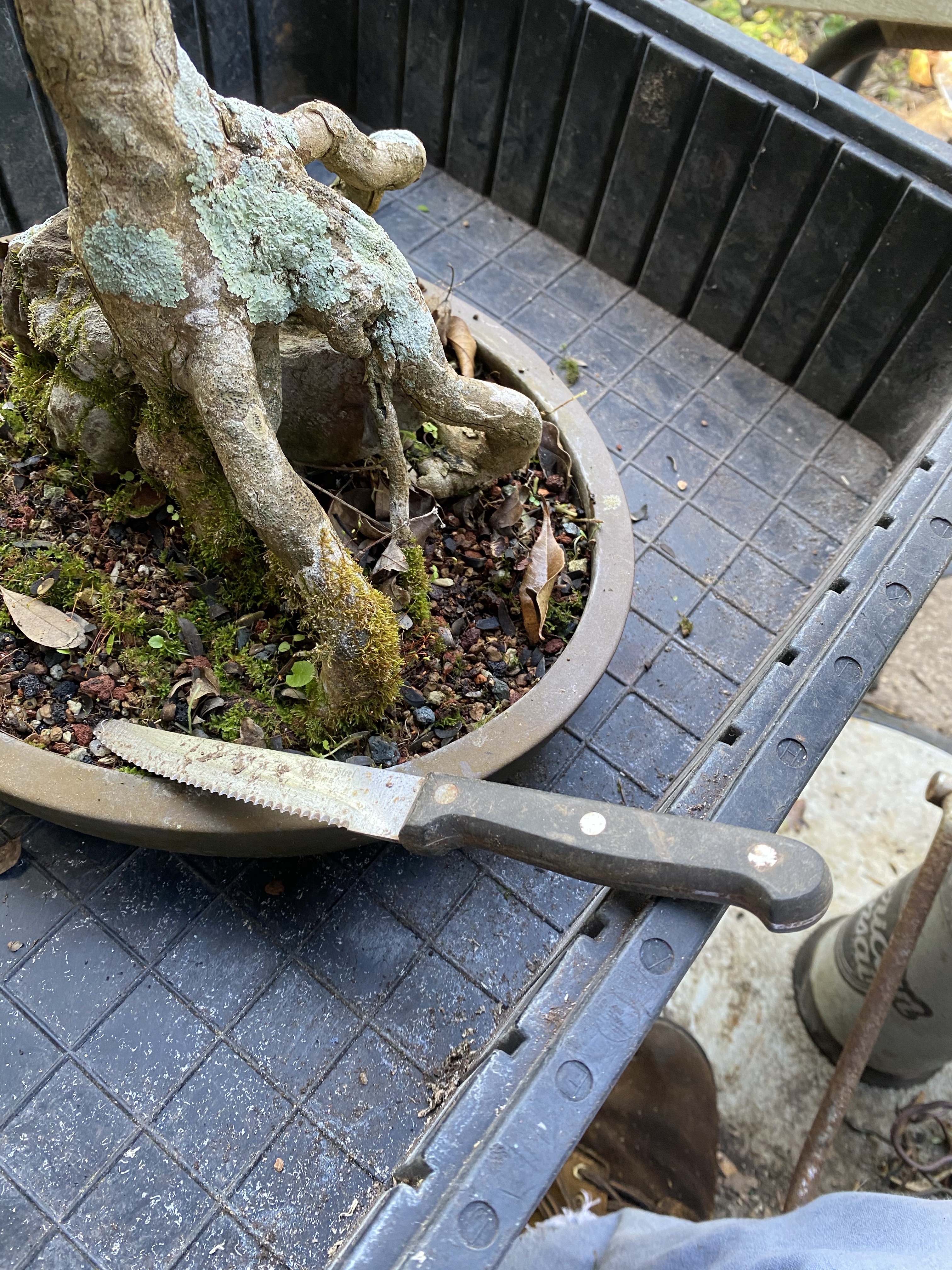Since it’s been a few years between the last repot, the root pad is circling around like a racecar in Nascar race. Describing an oval for 500 miles and going nowhere.