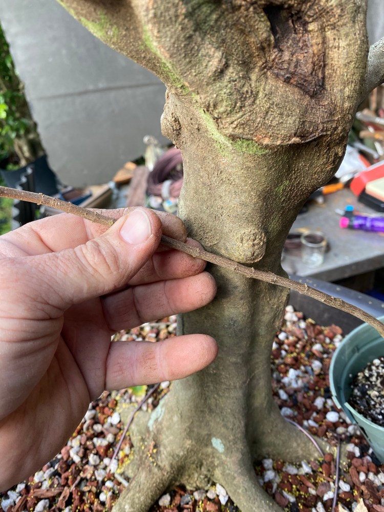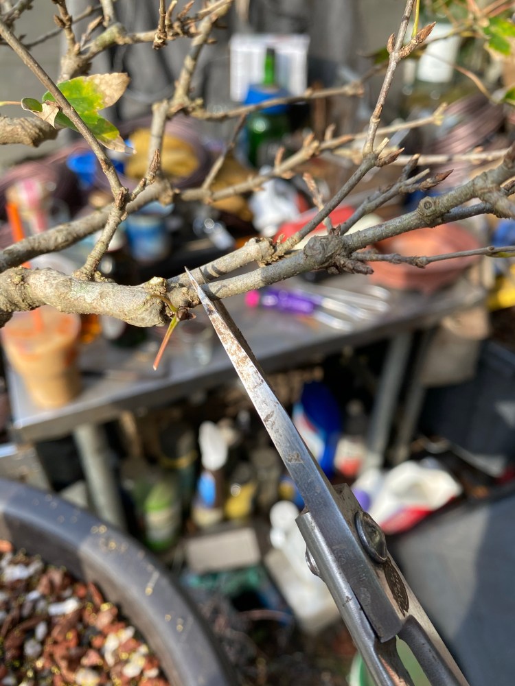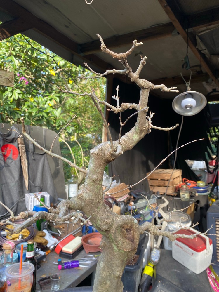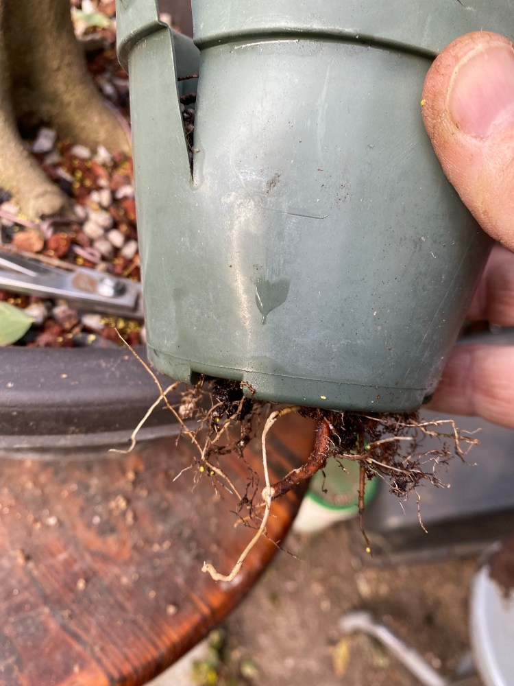 This was from the same batch where he put CD’s under the roots to improve the nebari root spread. The work today will be a thread graft, repot, and bud selection.