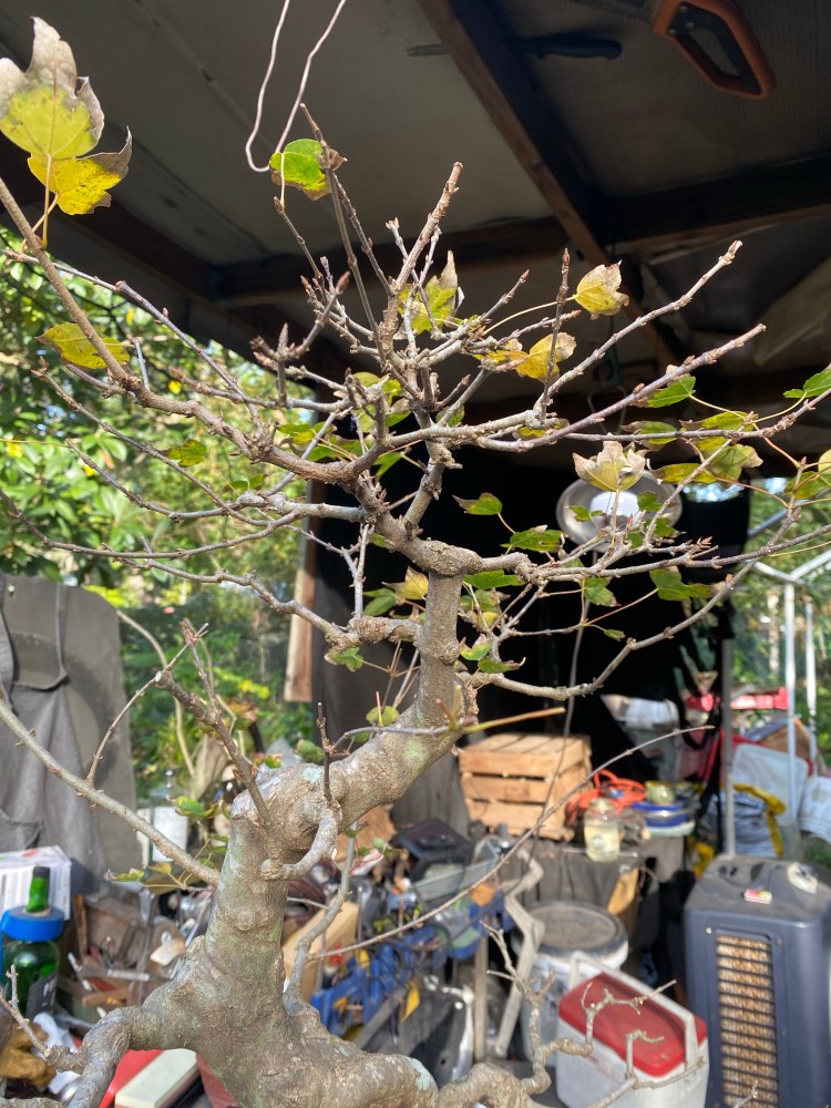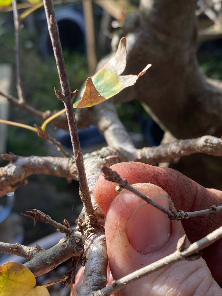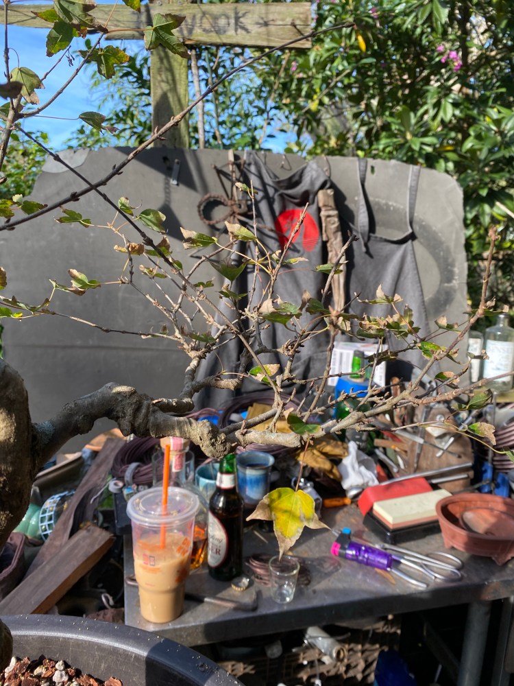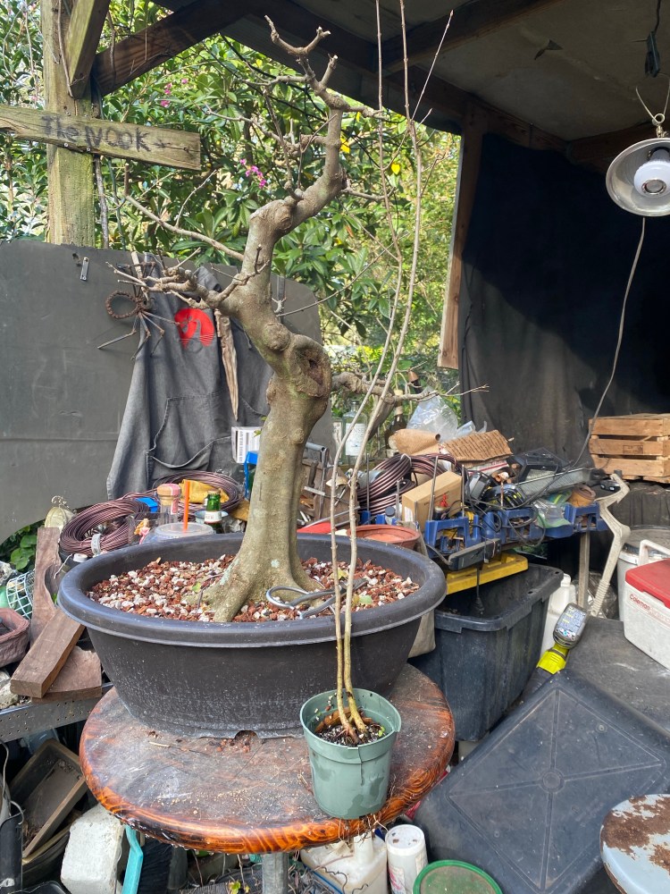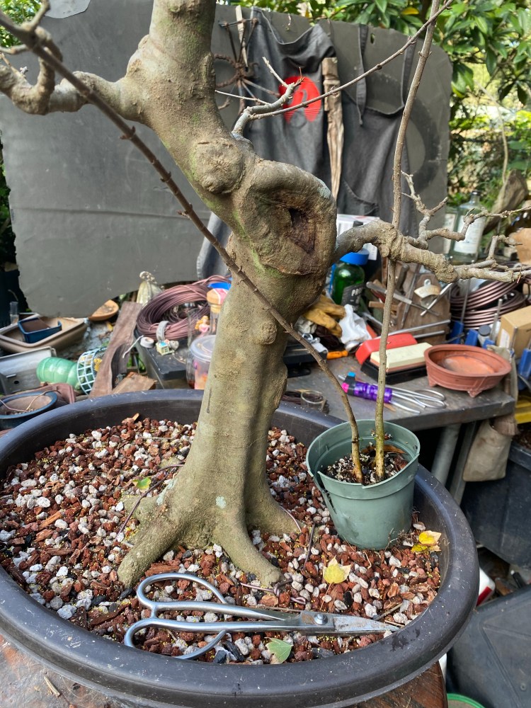 This was from the same batch where he put CD’s under the roots to improve the nebari root spread. The work today will be a thread graft, repot, and bud selection.