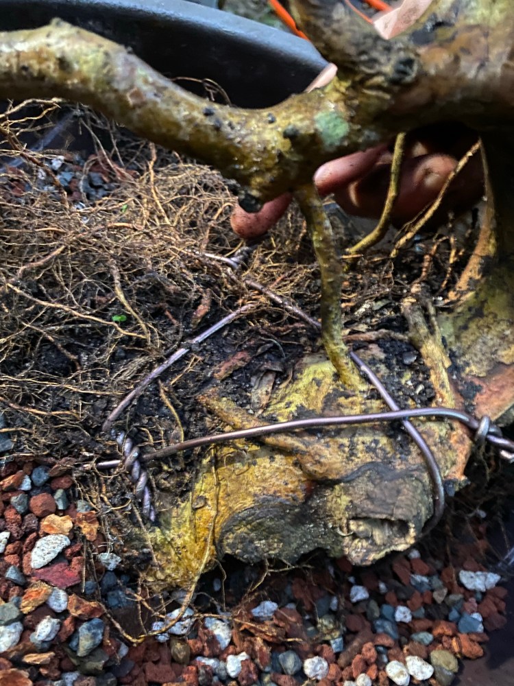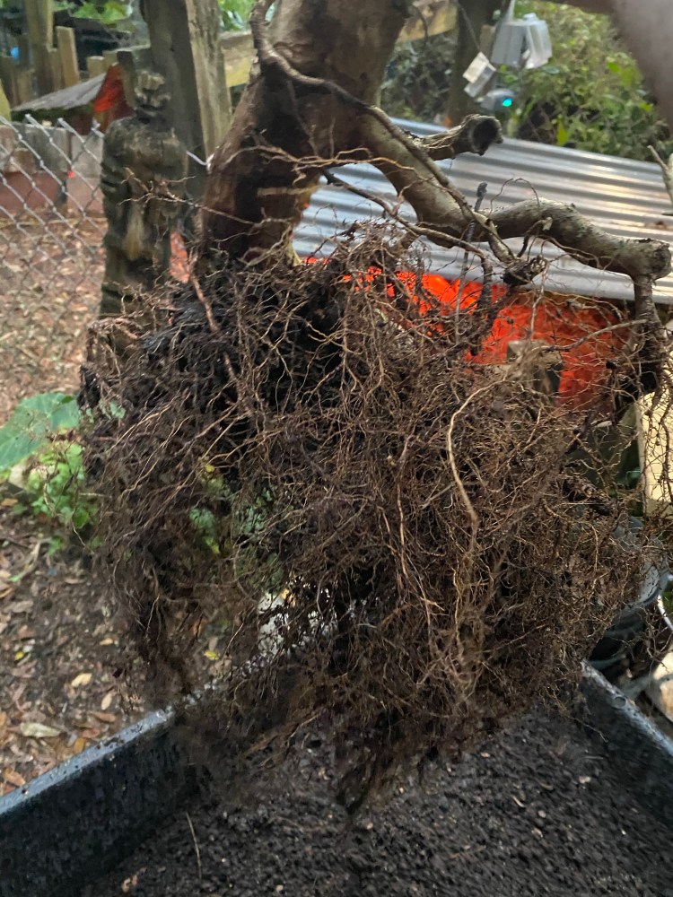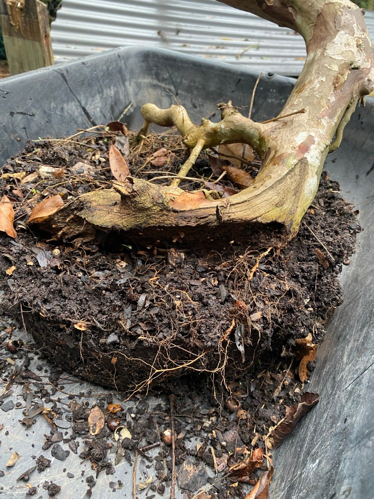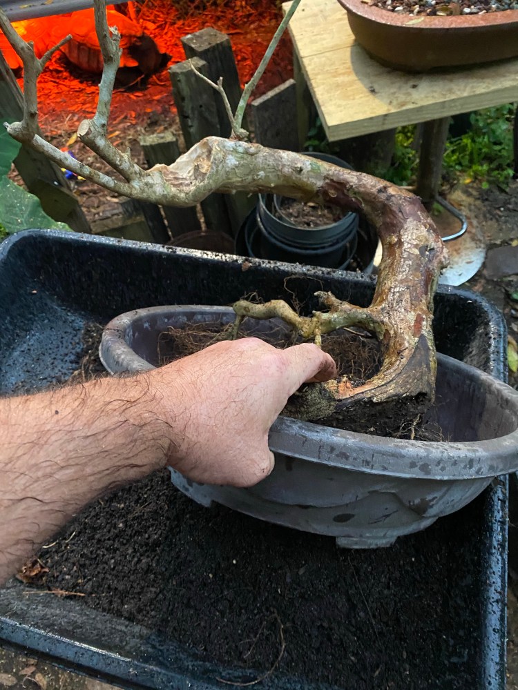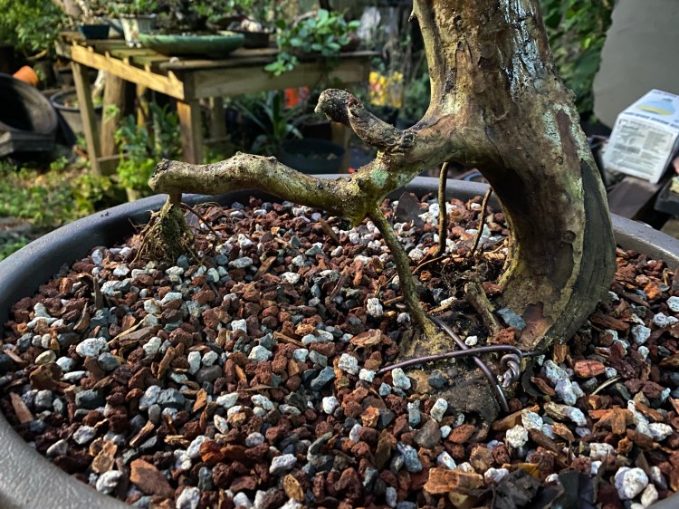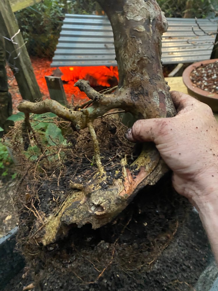 The soil was broken down pretty badly. Good in a deep pot but in a bonsai pot the small particles hinder drainage. Here’s a quote: “it doesn’t matter what your soil is made of, it’s the particle size that helps or hinders drainage”