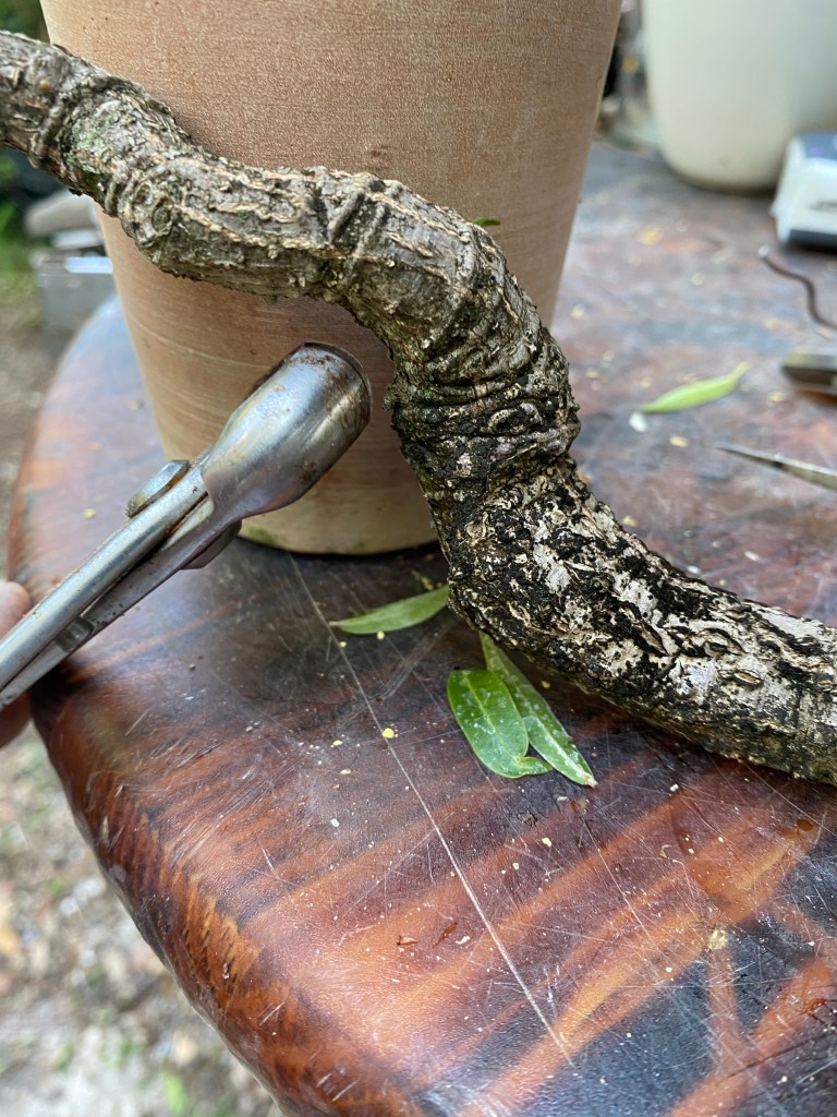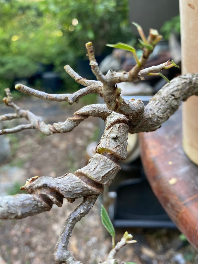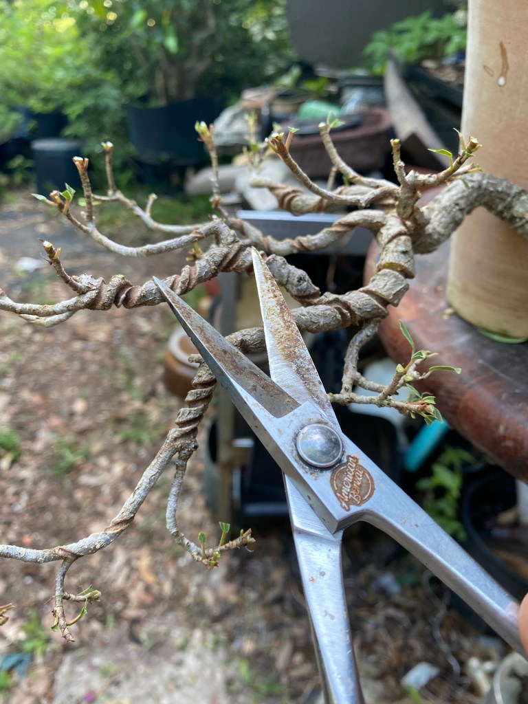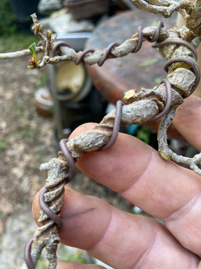 Well, first, take the wire off. I prefer to unwind (maybe an adult beverage, some smooth jazz, a nice breeze, after a hard day in the nursery) it. I teach unwinding to remove wire as opposed to cutting it off as it teaches you to have respect for the fragility of the branches and gives your hands “muscle memory”, because removing wire is much like putting it on. Also, this is aluminum, not copper. Copper (mostly) has to be cut off, in the larger gauges especially due to how it hardens off after you wrap it around the branches.