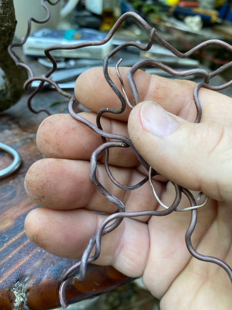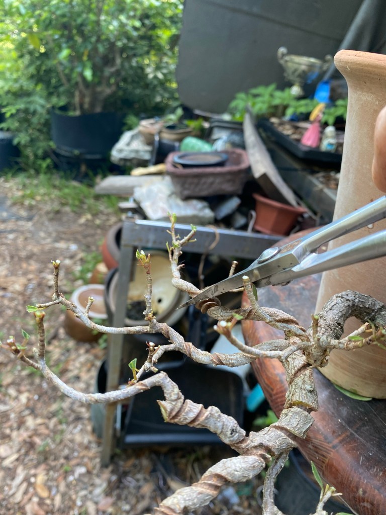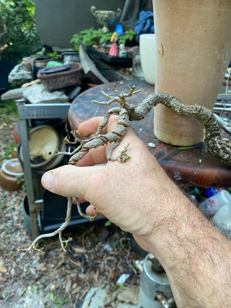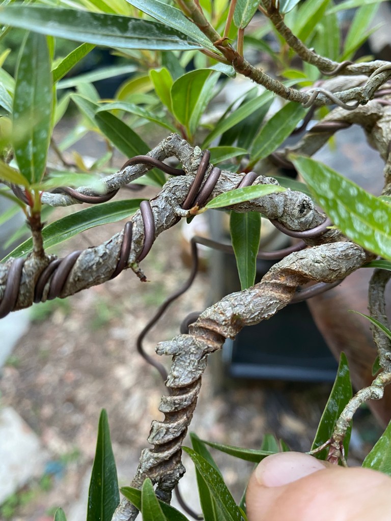 Well, first, take the wire off. I prefer to unwind (maybe an adult beverage, some smooth jazz, a nice breeze, after a hard day in the nursery) it. I teach unwinding to remove wire as opposed to cutting it off as it teaches you to have respect for the fragility of the branches and gives your hands “muscle memory”, because removing wire is much like putting it on. Also, this is aluminum, not copper. Copper (mostly) has to be cut off, in the larger gauges especially due to how it hardens off after you wrap it around the branches.