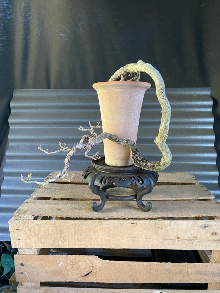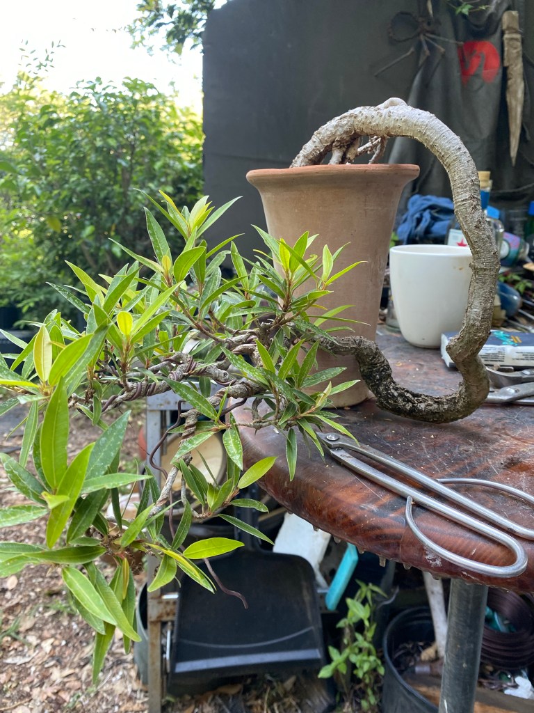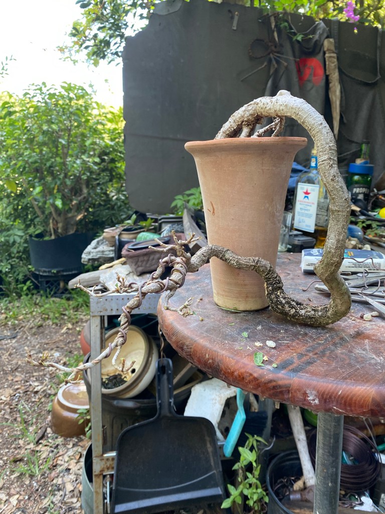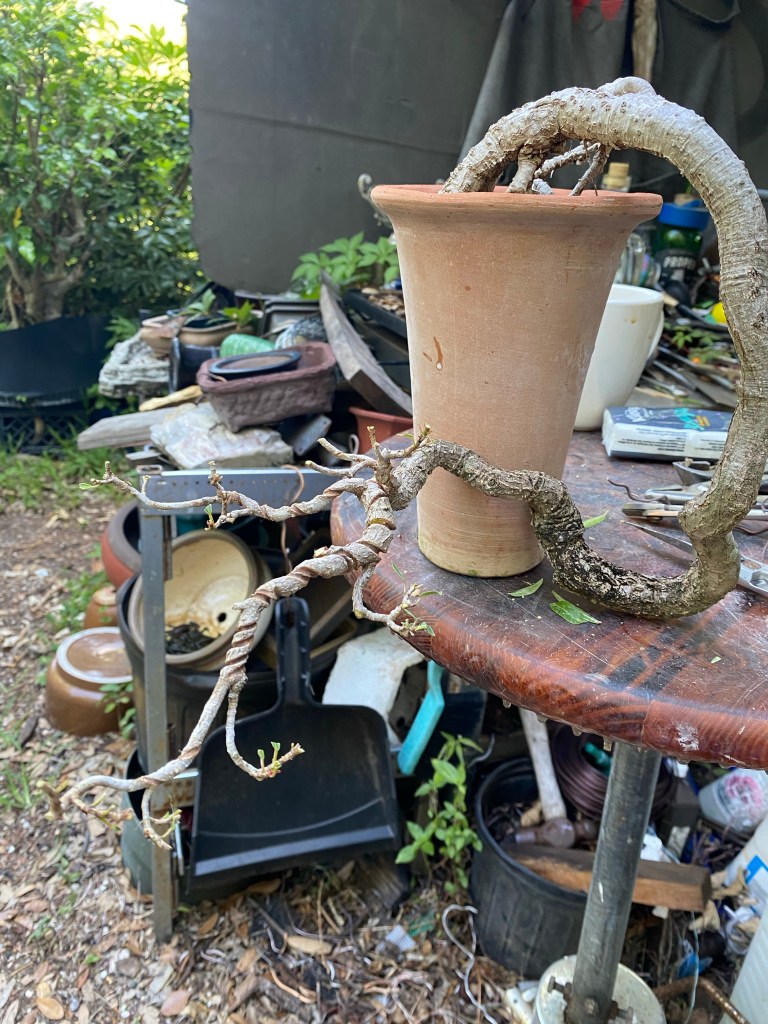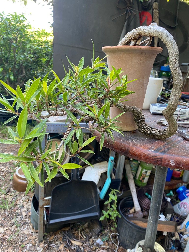 Here’s a cool tree, a cascading willow leaf ficus, originally a root cutting, literally the root from another bigger tree cut off so it fits into the pot, then the tree puts out new growth from the cut off root end. Don’t waste those roots!