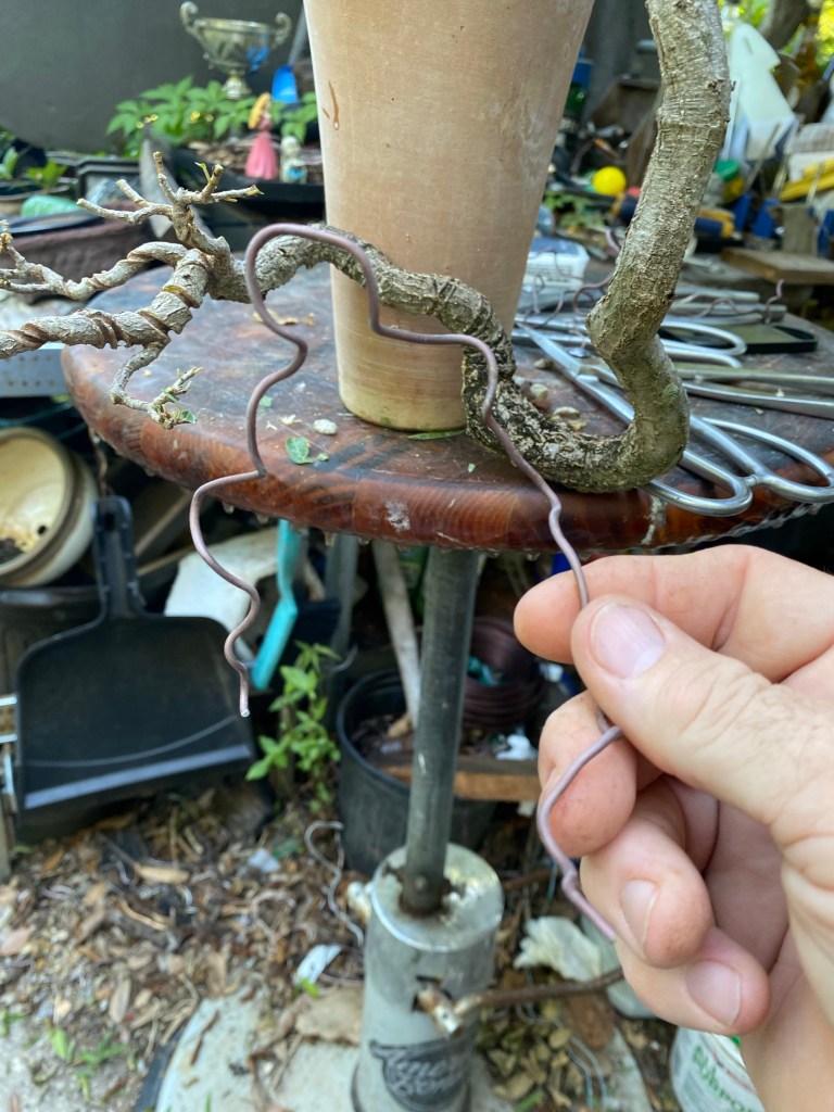 And make sure you wrap it in the opposite direction. It’ll stay on for it to cut in again, which isn’t a bad thing. Why? It’ll take a few more wirings to make it stay in place, and each wire cut shows you the branch has grown.
