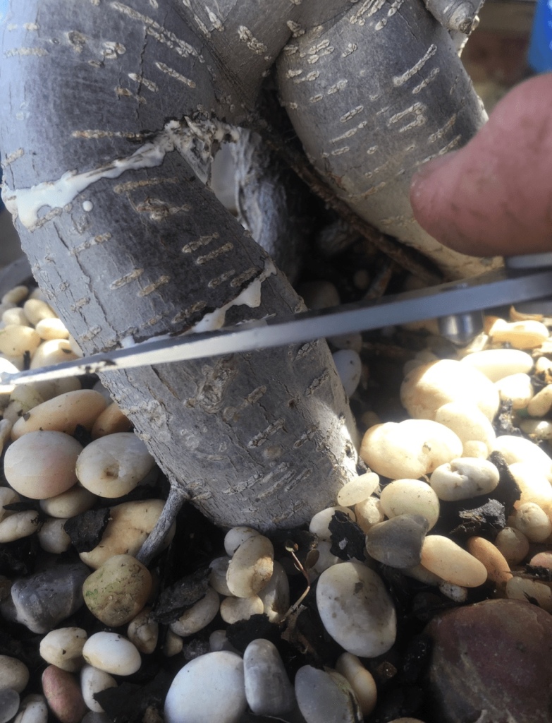 The first cut is to remove a strip of bark (and cambium) from the raised roots.