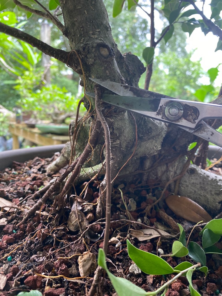 We want the roots to ramify as well, so when it doesn’t, on ficus or other trees that heal (like tridents) we can split them and then spread them out. and we can spread out the aerial roots too, editing out some that cross.