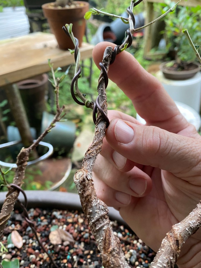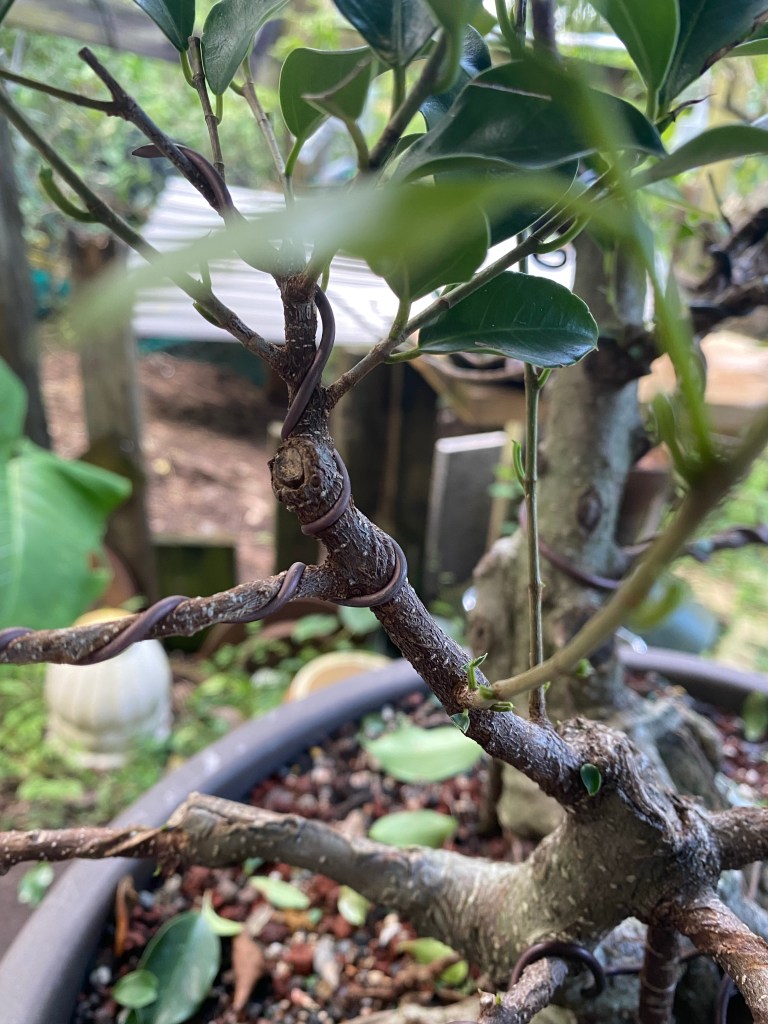 I once had a long discussion with Peter Warren, bonsai guy from England, apprenticed to Kunio Kobyashi, and he related his frustration he has with some clients he travels to removing the wire too early, before it cuts in, because of this need for perfect branches, and he has to rewire the tree because the branches never set and have all risen. And this is on deciduous trees, mind you, not ficus.