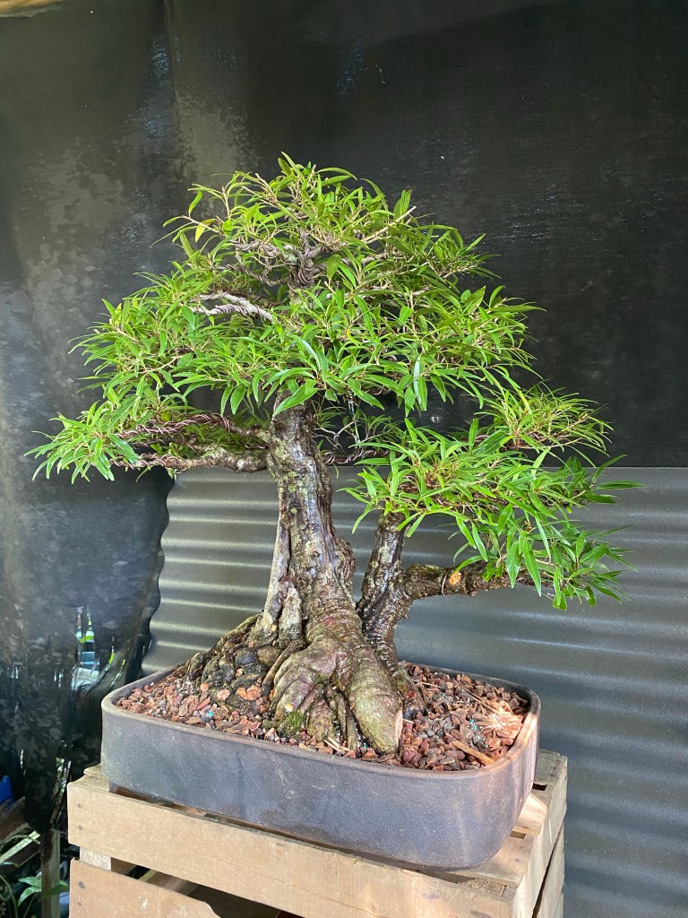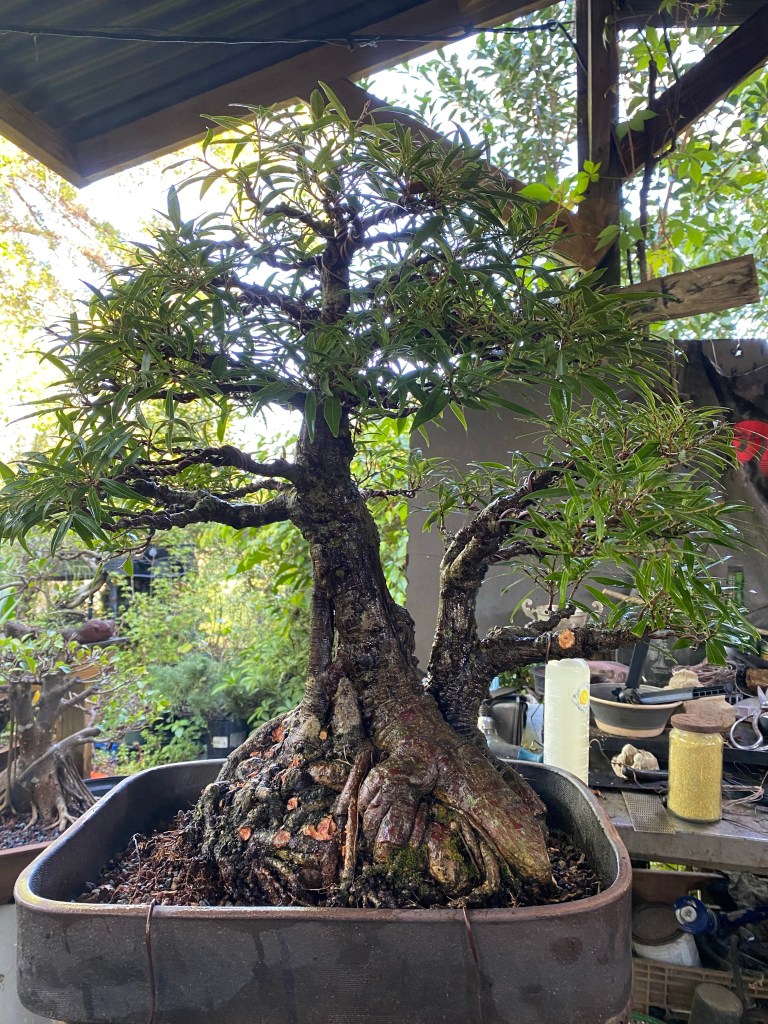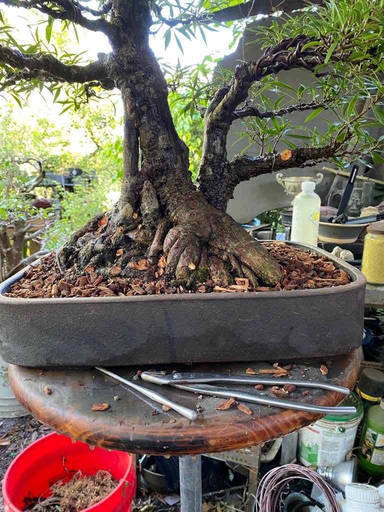 Notice I favored the left side when positioning. The reason is because the “first” branch is on the right, and the “apex” is more centered by pushing the tree to the left. If balance is what you want (which you may not want balance), and with the style of the tree (an informal upright), it needs balance , then, always try to center the apex over the middle of the pot. I also didn’t defoliate this time. Sometimes I do, but this time I’m seeing what will happen. I’m always trying to see what works best.