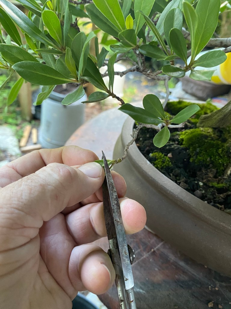 First step, defoliation. I know, oooooooohhhhh, controversial. It astounds me that so many professionals not only poo poo defoliation as a valid technique, but try to vilify those who use it. One of my catchphrases I use all the time is “horticulture is a science, but the practice of horticulture is an art”. That’s why two people can use two seemingly different techniques and still achieve success. Most of bonsai technique has more to do with the timing and seasonality of the technique and less to do with doing it. Here’s an example: there aren’t any arborists that suggest that removing a pine trees candles is ever a good idea. Yet, if one does it at the right time, the way we bonsai practitioners do, the tree responds with increased vigor and better growth.