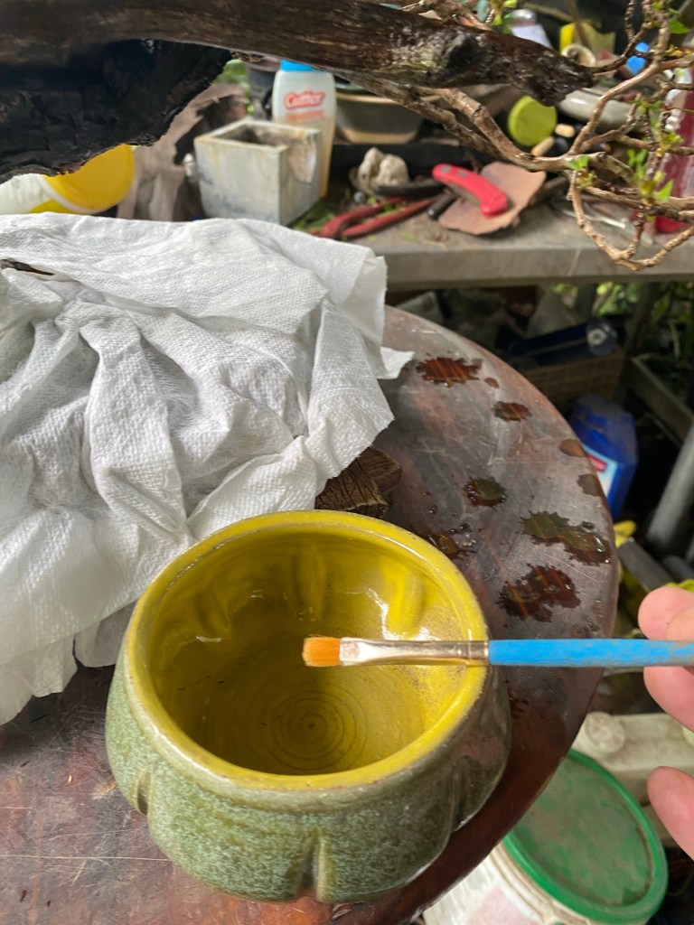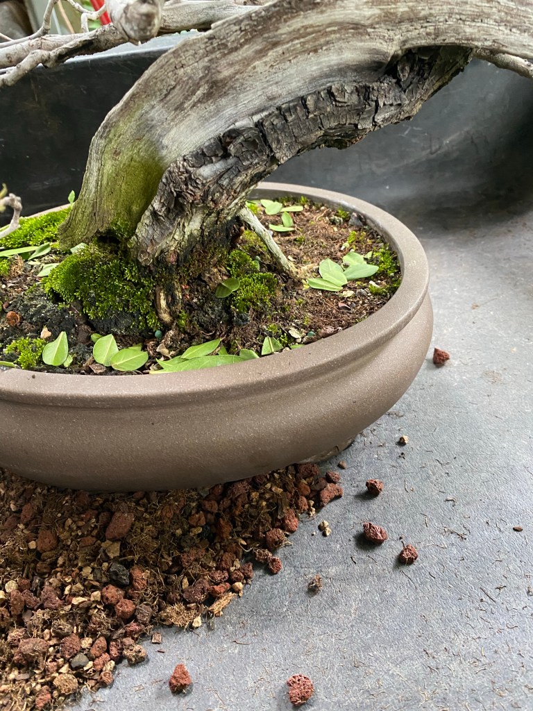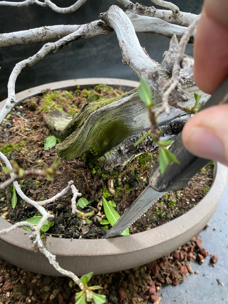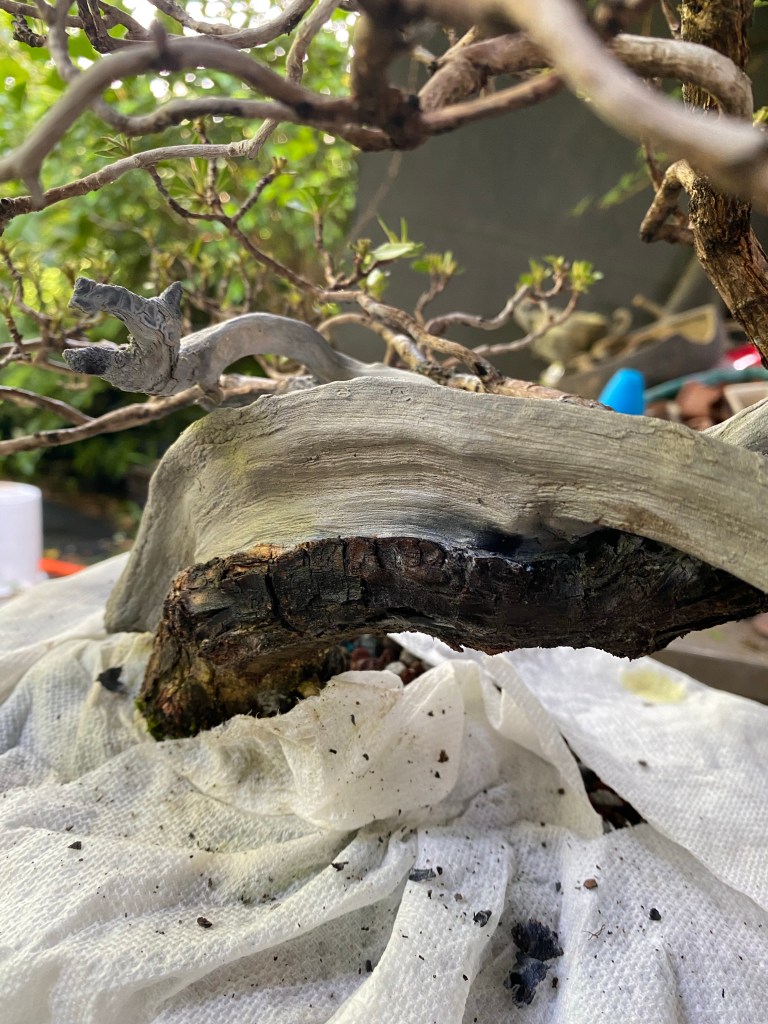I’ll also be cleaning and applying lime sulfur to the deadwood, which is, as you’ll see, sometimes easier when the tree is in the middle of a repot.