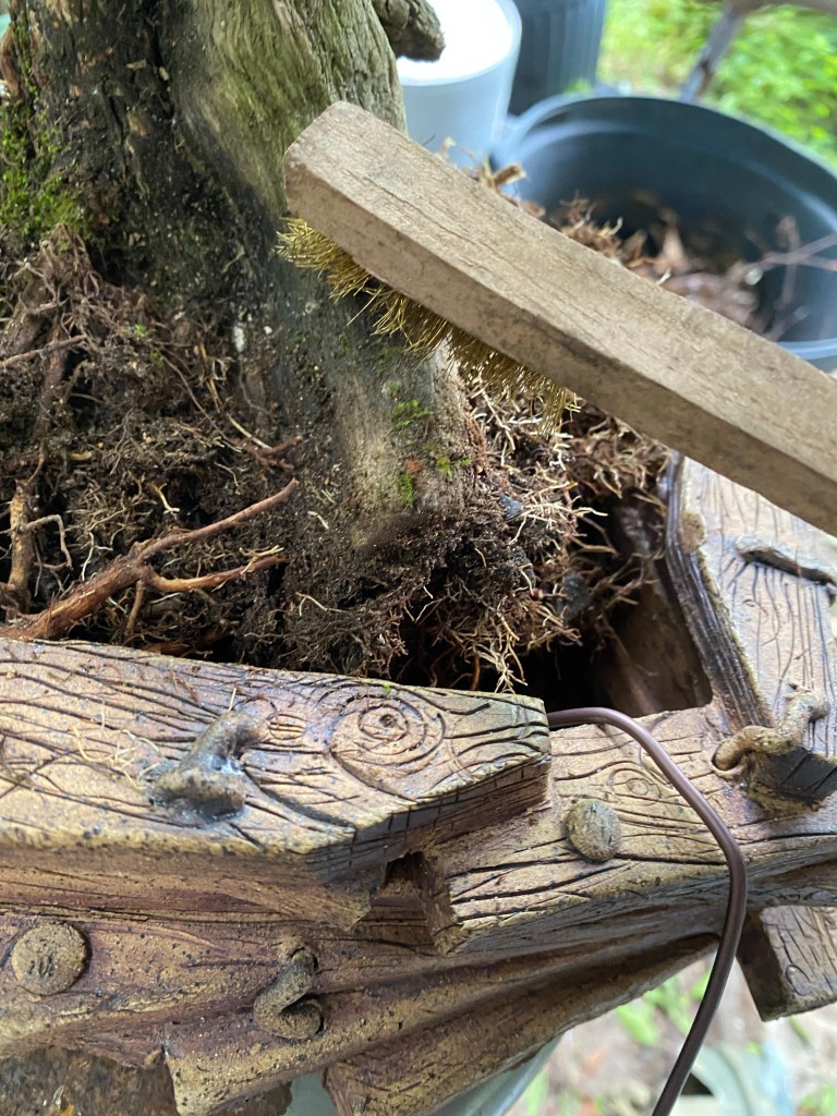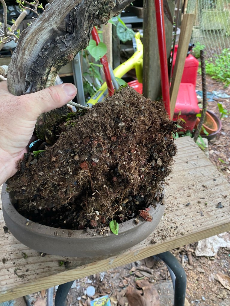 Before I put it into the new pot, I’m going to use a wire brush to clean the deadwood (“Wire brush?” You ask, because it works. You’ll have to say that part out loud to get the joke). It’s also easier to clean the deadwood while it’s out of the pot, better to get at all the surfaces if you can turn the tree upside down.