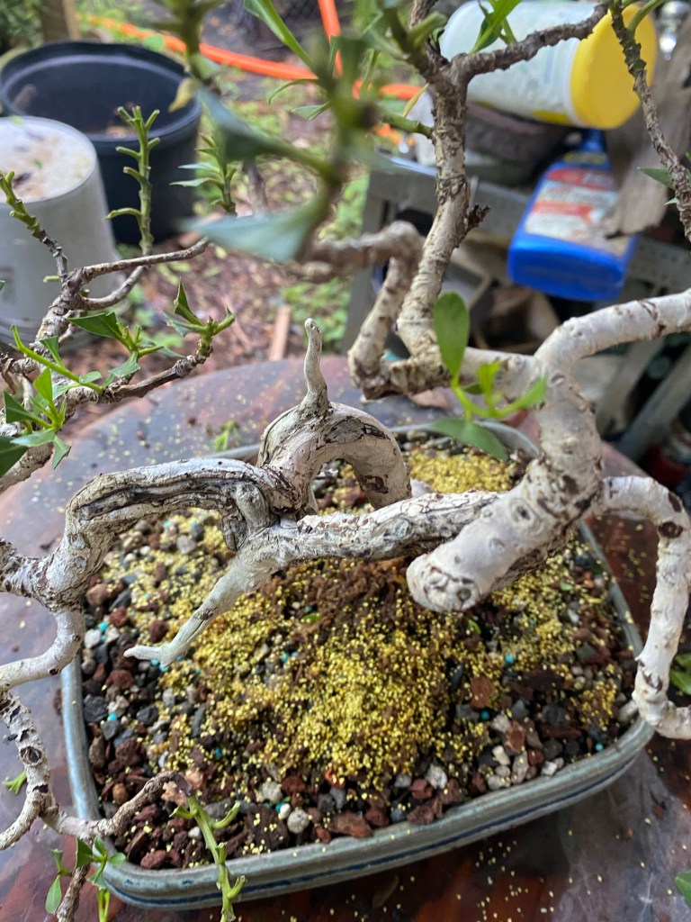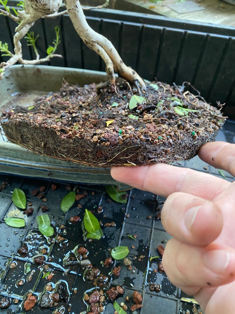 Anyway, the defoliation and root reduction during a repot helps to balance that transpiration. There are times when you should not defoliate when you repot, which I will cover in an upcoming Brazilian Raintree post, so you’ll have to wait for that one.