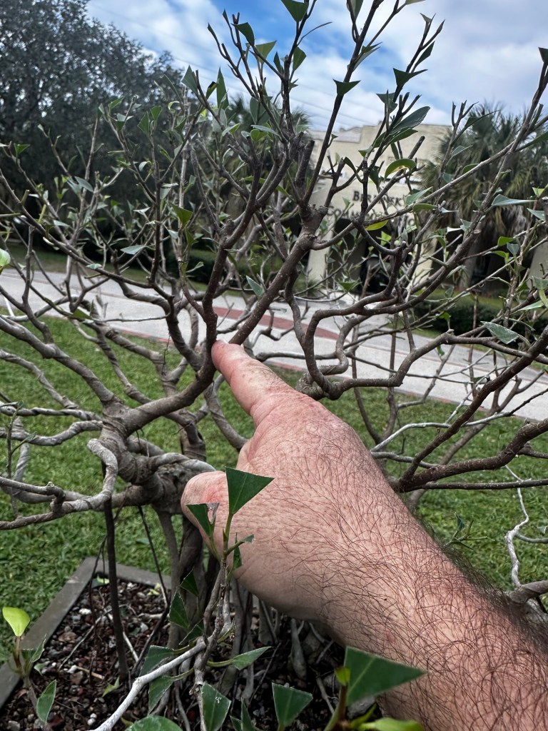 It’s usually just water spots from dissolved solids in your water. Like calcium, or lime. If it’s red or orange, it’s iron rust. it’s not harmful acutely, just ugly, but it could be a problem if it’s built up so much that it blocks the sun and restricts photosynthesis. And how do you get rid of it? You can polish the leaf, or use leaf shine, or, like I’m doing, cut them off. A ficus can hold a leaf for up to three years (it’s a tropical, broadleaf evergreen). But you can defoliate one, as long as it’s healthy, up to four, five times a year. I usually do at least twice in my normal maintenance. If I’m really pushing a tree, 3-4 times.