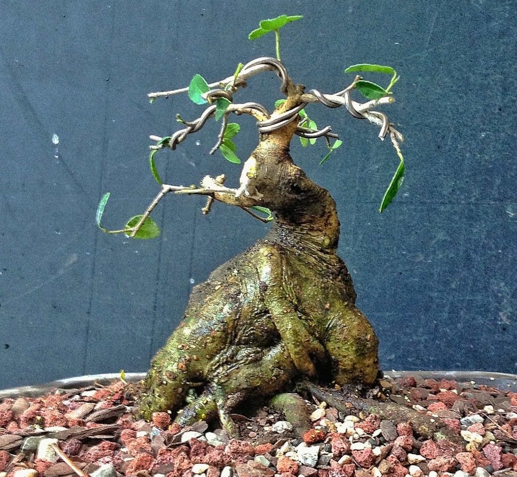 The clone was a clipping from a trimming session, I put a large piece that I couldn’t see myself tossing away. So I put some rooting hormone on the cut placed it in a flower vase and water for 5 years, when I potted it I held 1/3 of the root system above the mix. It has a heavy 3 foot trunk with just a few small branches.